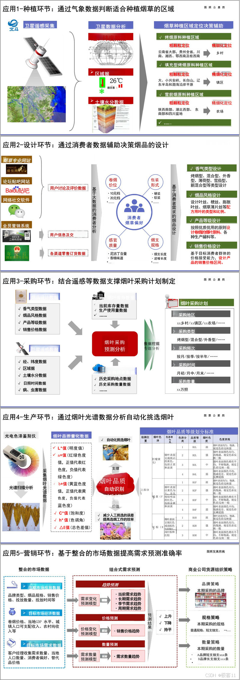 在种植环节,利用气象数据和卫星遥感技术,辅助决策烟草种植区域。在设计环节,基于消费者数据,优化烟品设计,满足市场需求。在采购环节,结合遥感数据和库存数据,制定科学的烟叶采购计划。在生产环节,通过光谱数据分析,实现烟叶自动化挑选,提高生产效率。在营销环节,整合市场数据,提高需求预测准确率。在零售环节,通过零售户数据,辅助新品投放策略,优化销售网络。