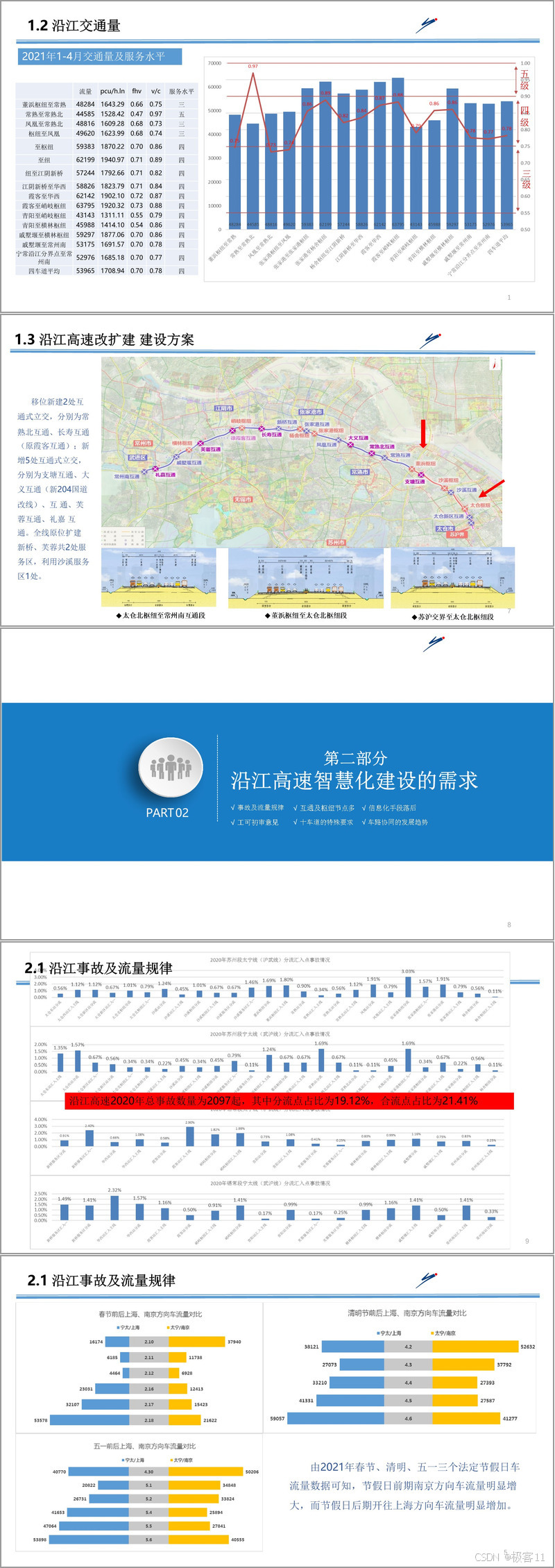 沿江高速2020年总事故数量为2097起,分流点和合流点分别占比19.12%和21.41%。节假日车流量变化显著,南京方向和上海方向的车流量在节假日前后期有明显波动。