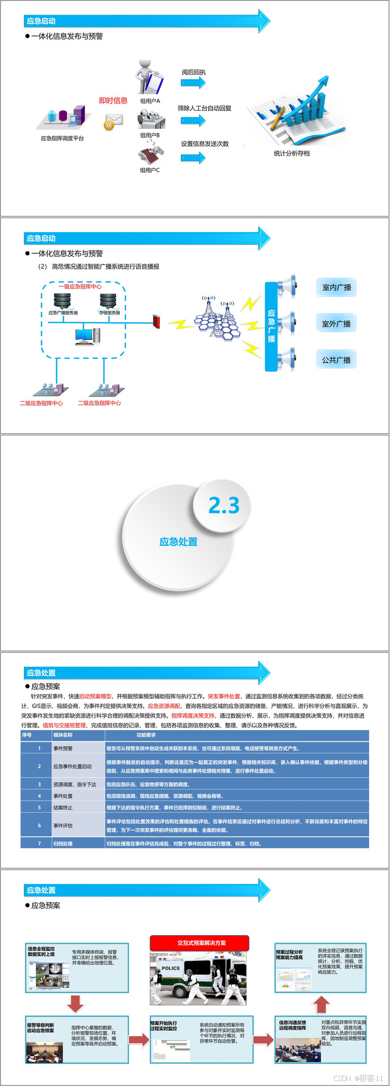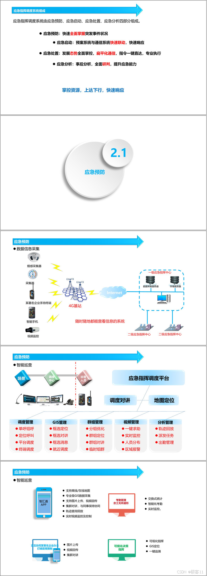 应急指挥调度系统通过分布式云架构集成数据图像、音频、控制信号,实现音视频信号的高保真网络传输。系统由应急预防、应急启动、应急处置、应急分析四部分组成。应急预防阶段通过前端设备采集数据,进行智能巡查和报警联动;应急启动阶段通过一体化信息发布与预警系统,快速响应重大事故;应急处置阶段通过应急预案和融合通信系统,实现扁平化通信和指令一键直达;应急分析阶段通过预案管理和应急资源库管理,提升应急处理能力。