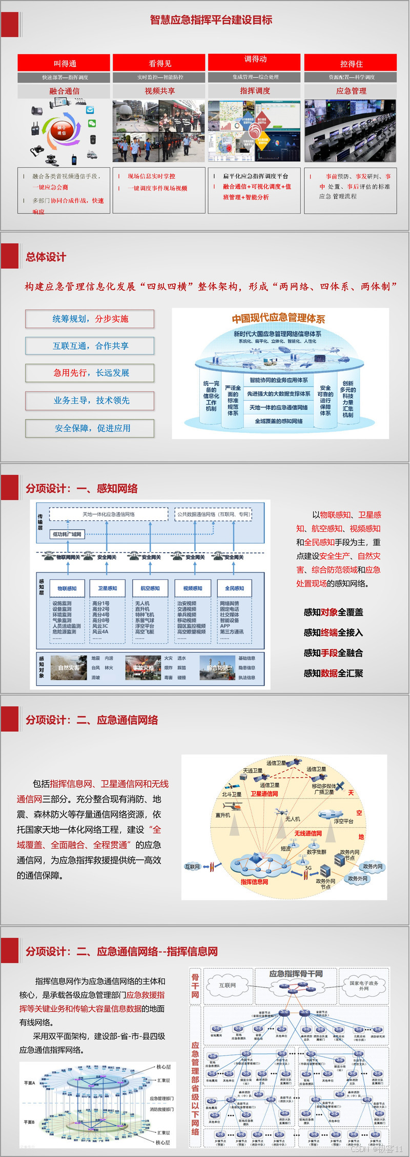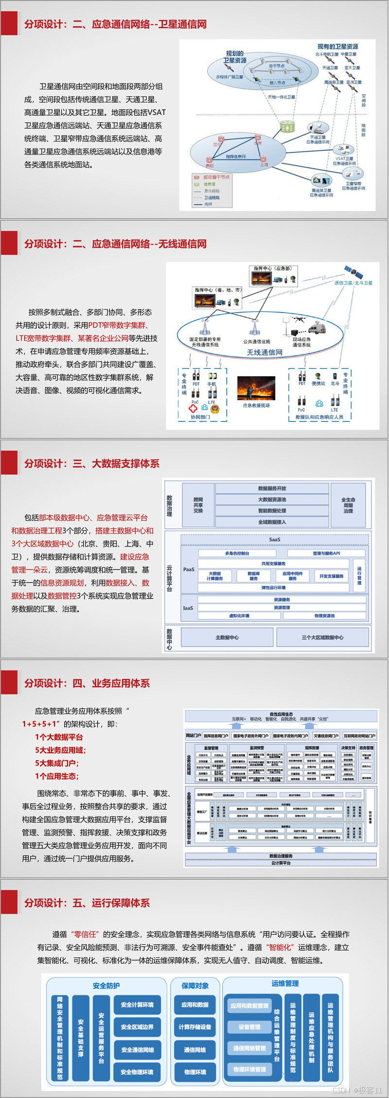以地市级应急信息化建设为例,总体规划框架包括应急基础设施建设、网络搭建、数据治理、业务应用开发、运行保障和标准规范制定。在分项设计中,感知网络接入已有系统数据,新建监测预警系统;指挥信息网与其他单位横向连接,确保网络畅通;卫星通信网按规划建设远端站等设备;应急管理综合应用平台整合业务系统,开发个性化功能;数据治理系统梳理数据目录并进行接入与汇聚;自然灾害和安全生产风险监测预警系统分别针对不同领域进行风险监测与预警;政务管理应用打通部门信息孤岛,实现政务办公规范化;应急指挥信息系统完善物理场所和融合通信系统,实现突发事件处置可视化;认证授权与密码服务提供统一身份管理和安全保障。
