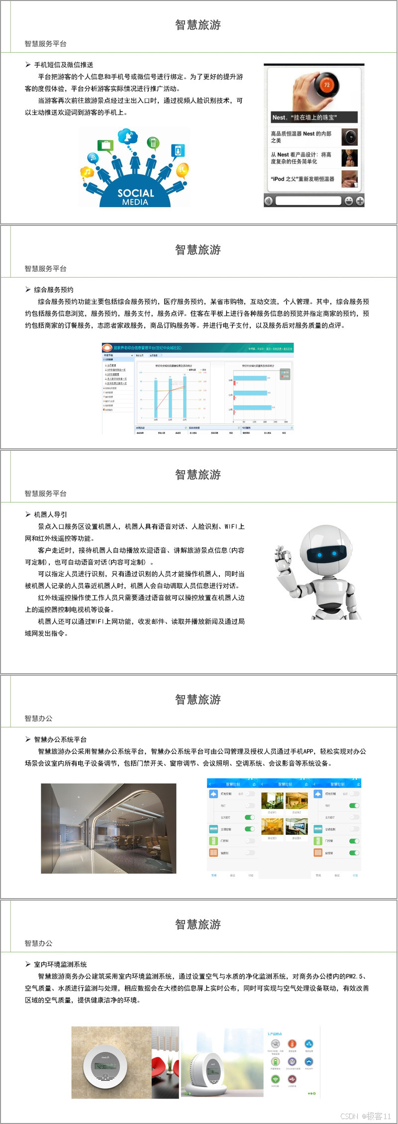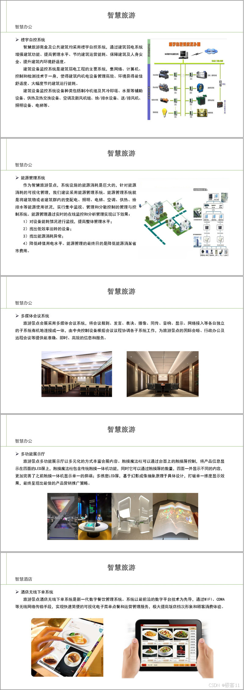 智慧办公方面,采用智慧办公系统平台,员工可在线预约会议室,实现异地办公。同时,通过室内环境监测系统、楼宇自控系统、能源管理系统等,提升办公环境质量,实现低碳环保、绿色节能。多媒体会议系统和多功能展示厅则为旅游景点的会展活动提供了高效的信息服务和多元化的展示方式。