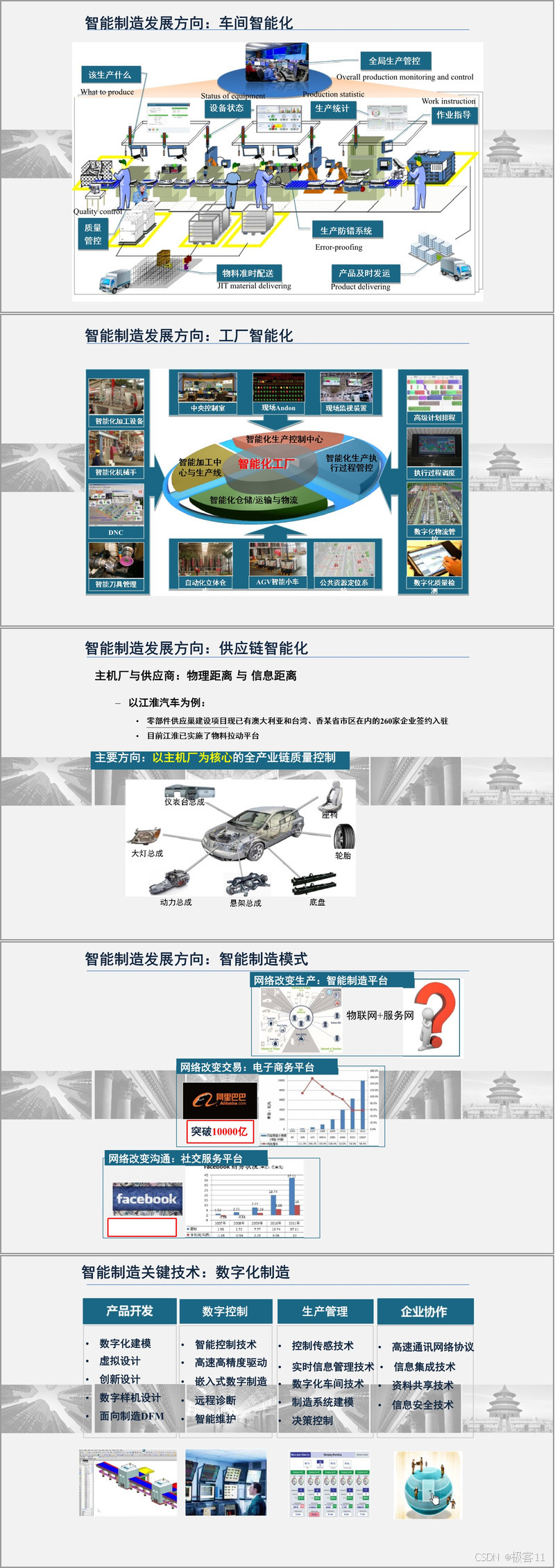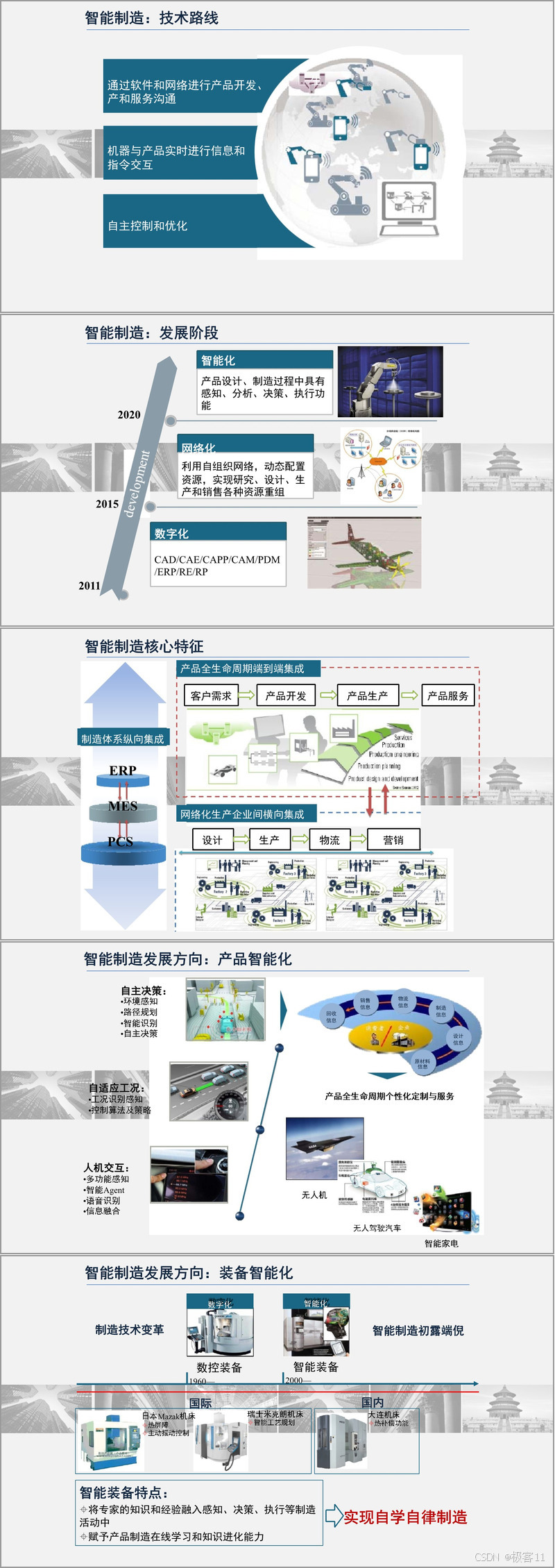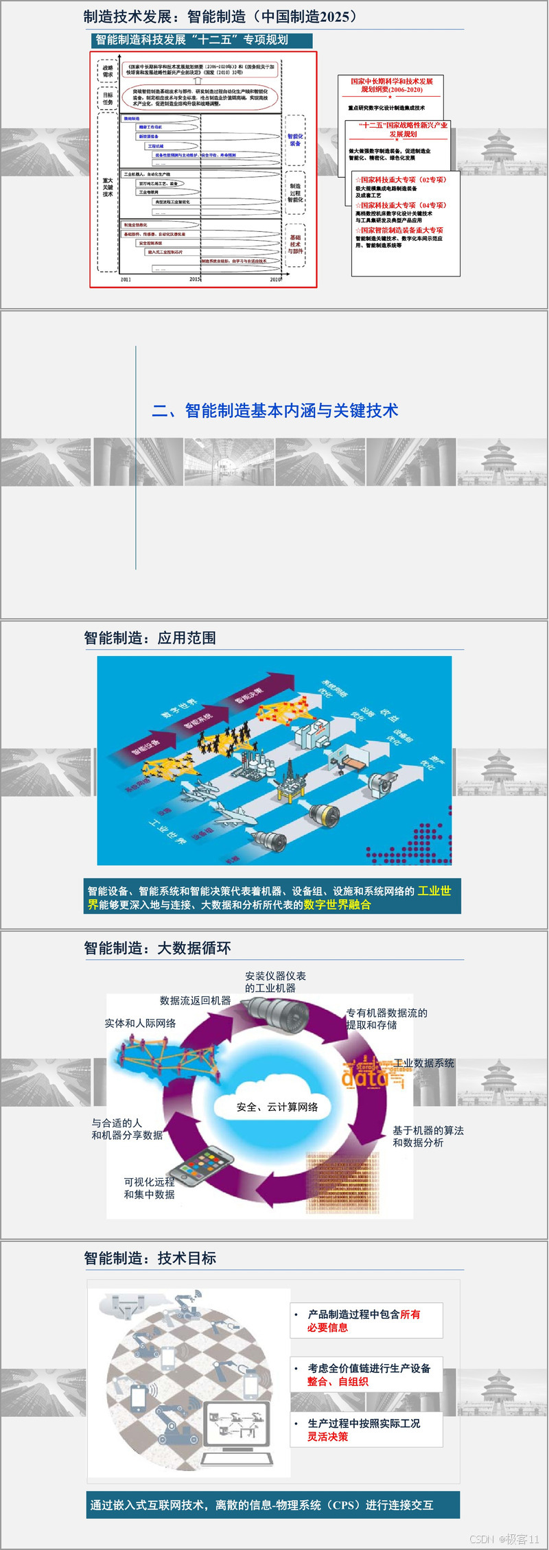 智能制造通过智能设备、智能系统和智能决策,将物理世界与数字世界深度融合。其技术目标包括产品制造过程中包含所有必要信息、考虑全价值链进行生产设备整合、自组织以及生产过程中按照实际工况灵活决策。智能制造的发展阶段从数字化到网络化再到智能化,逐步实现产品全生命周期端到端集成和制造体系纵向集成。