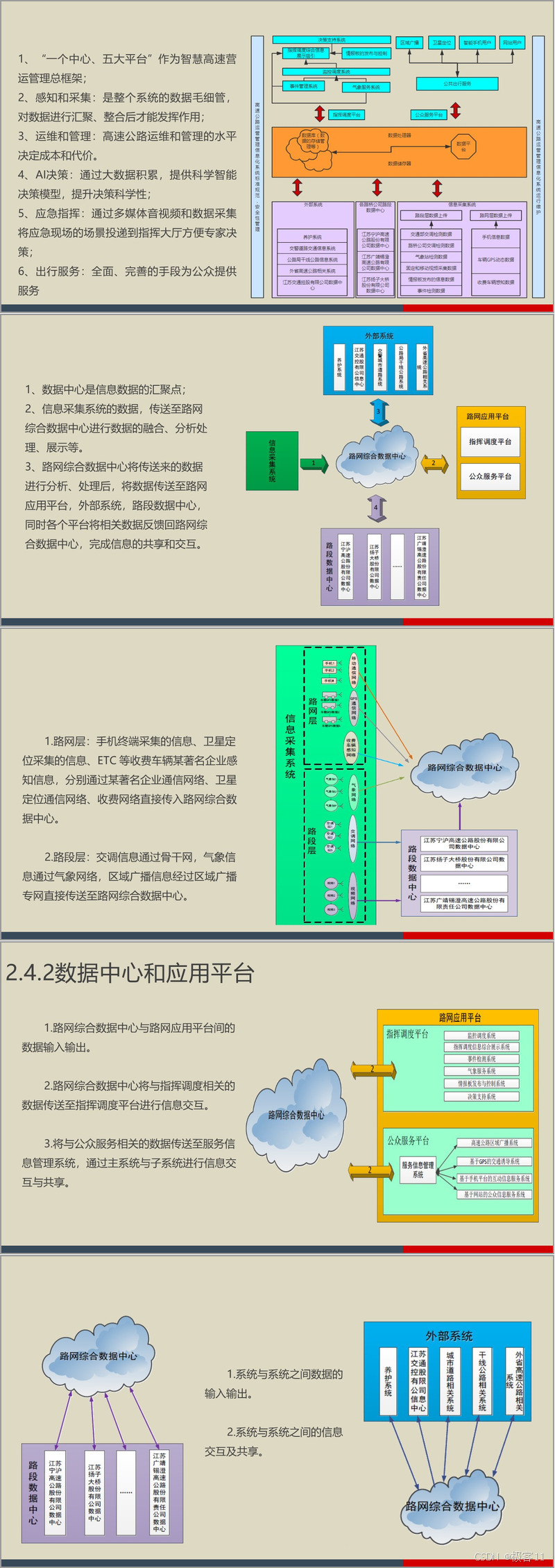 本方案提出了"一个中心、五大平台"的总体架构框架,构建了智慧高速营运管理的完整体系。数据中心作为整个系统的神经中枢,承担着信息汇聚、处理与分发的关键功能。系统架构分为逻辑架构和数据流架构两个维度,确保了各子系统之间的协同运作。