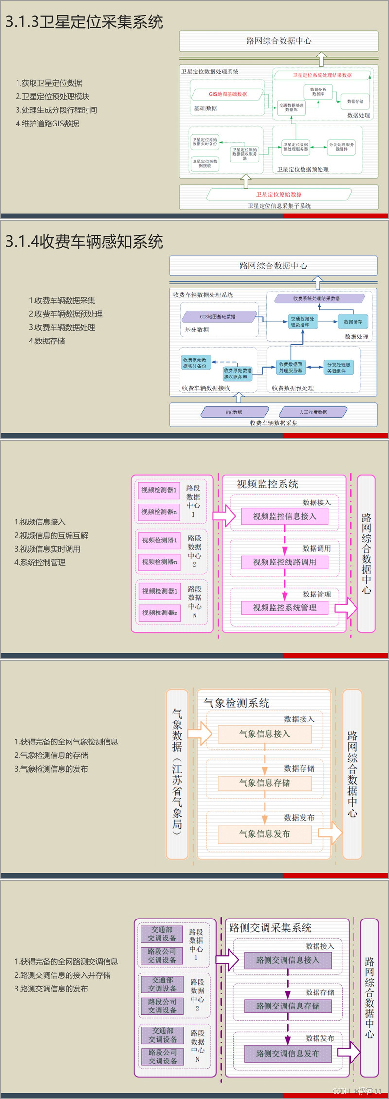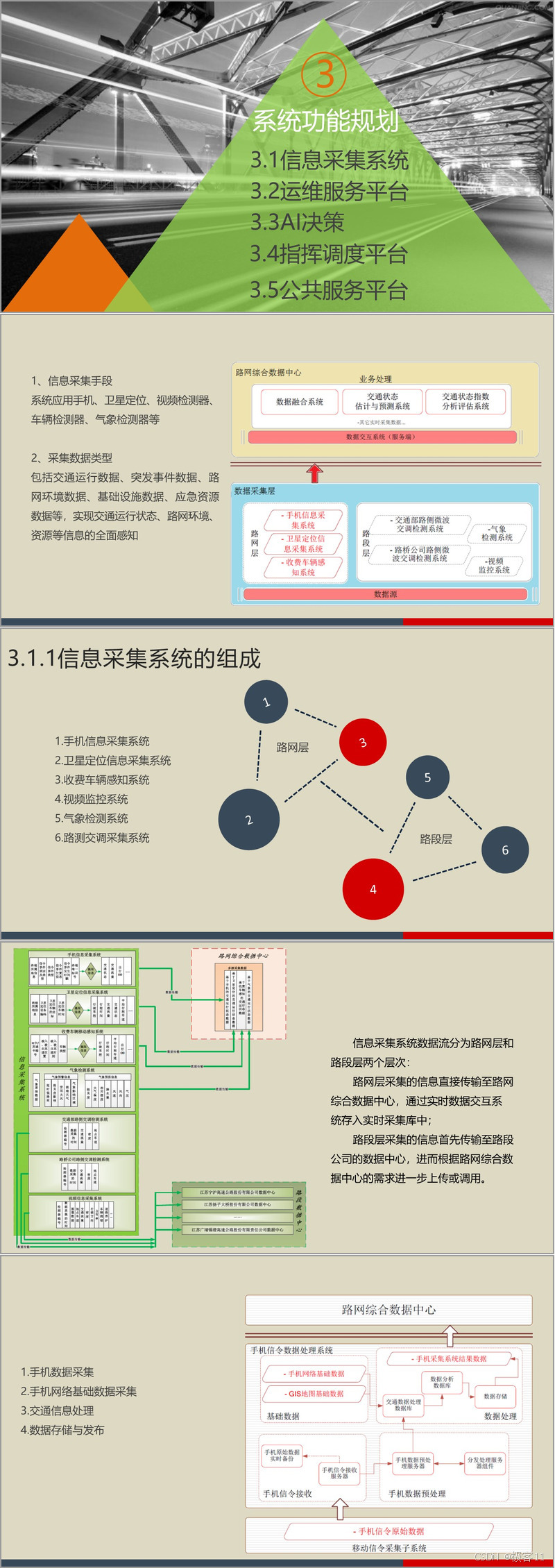 在数据采集层面,系统建立了多层次的信息感知网络。路网层通过手机终端、卫星定位和ETC收费系统采集数据,直接传输至路网综合数据中心;路段层则通过交调信息、气象数据和区域广播专网获取信息,经路段公司数据中心处理后上传。这种分层设计既保证了数据采集的全面性,又优化了数据传输效率。
