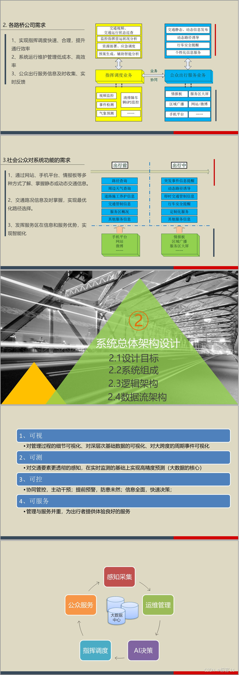 方案深入分析了三类核心需求:运营中心需求包括指挥调度自动化、全路网状态实时掌握、突发事件可视化处置和公众服务人性化;各路桥公司需求聚焦于提升通行效率、降低运维成本和优化信息反馈机制;社会公众则期待通过多种渠道获取实时交通信息,实现最优路径选择,并享受智能化服务区体验。
