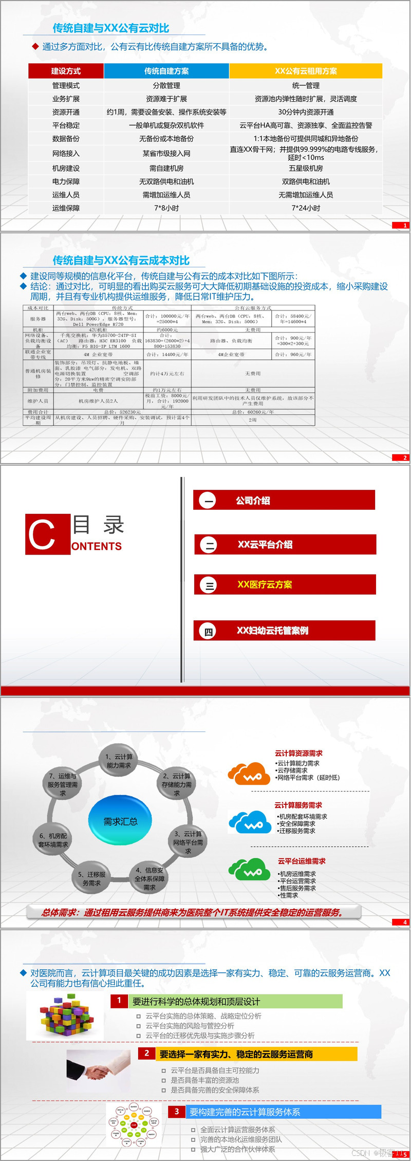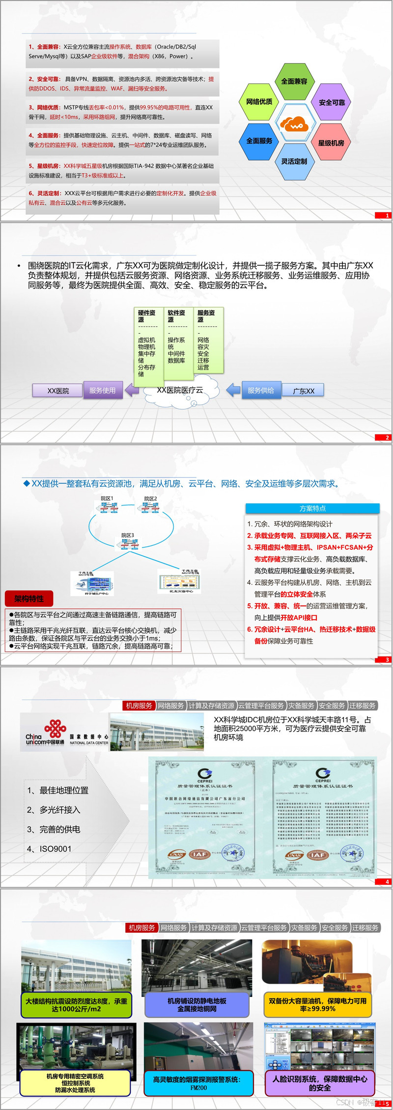 针对医院的IT云化需求,XX云公司提供全面的云计算服务体系。方案包括虚拟机、操作系统、网络、物理机、容灾、集中存储、中间件和安全等多方面的服务。通过虚拟+物理主机、IPSAN+FCSAN+分布式存储等技术,支撑云化业务的高负载需求。云服务平台构建了从机房、网络到云管理平台的立体安全体系,确保数据的安全性和业务的连续性。