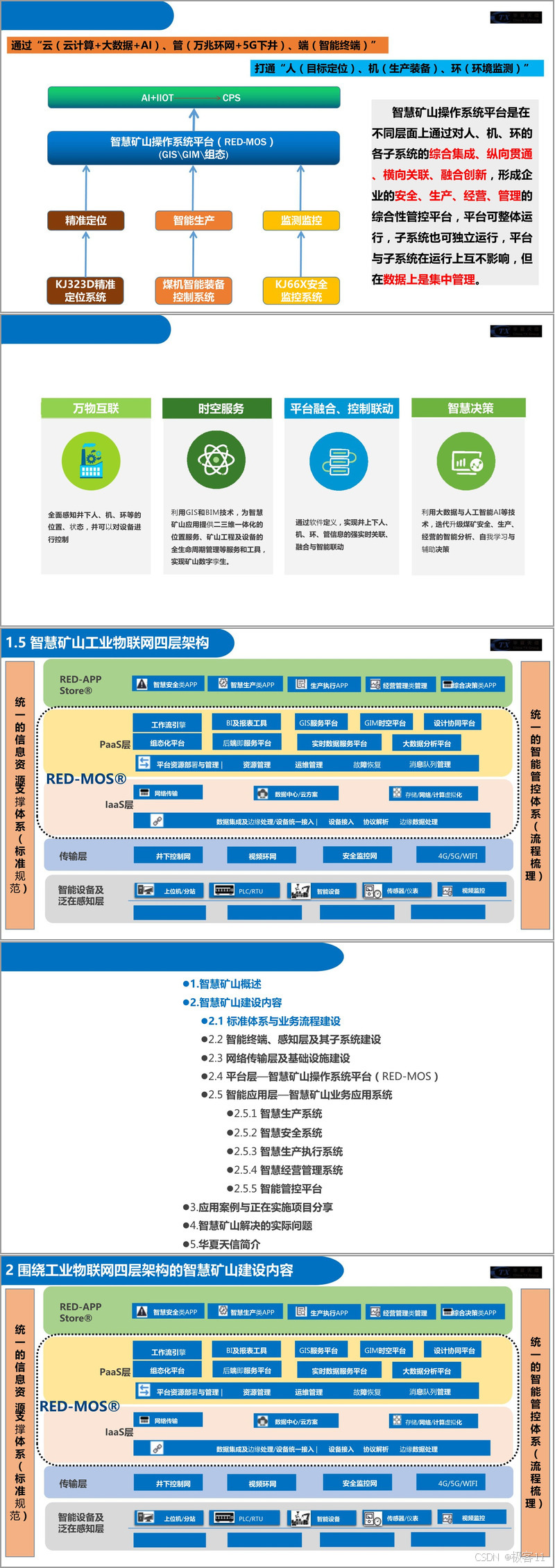 平台层的智慧矿山操作系统平台(RED - MOS)是智慧矿山建设的核心。它通过内置的多种平台和工具,为智慧矿山应用提供数据综合服务、时空位置服务、可视化展示、协同设计、业务流程自动化和大数据分析等服务和工具,实现矿山各部门的数据共享与协同工作,为智能化决策和自动化运行奠定基础。