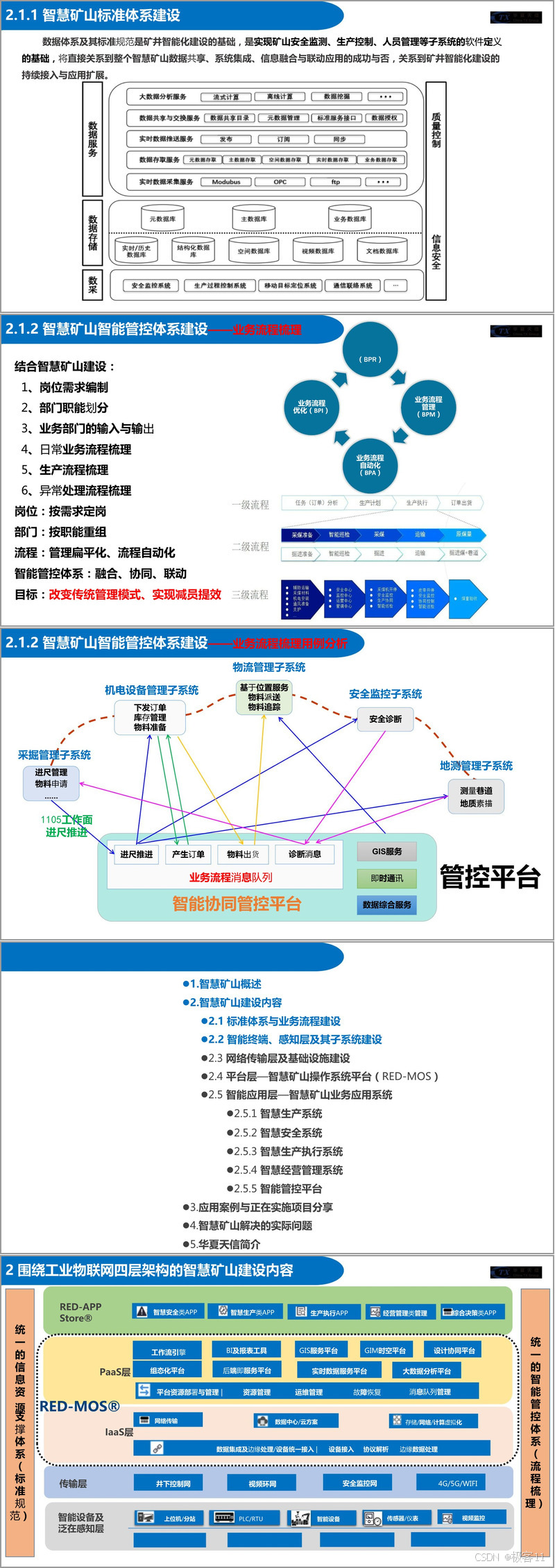 智慧矿山建设内容涵盖多个层面。标准体系与业务流程建设是基础,其中数据体系及其标准规范关乎整个智慧矿山的数据共享、系统集成等,而业务流程梳理则通过结合岗位需求、部门职能划分等,实现管理扁平化、流程自动化,达到减员提效的目标。智能终端、感知层及其子系统建设包括 KJ66X 安全监控系统、KJ323D 井下作业人员精确定位系统、煤机装备智能控制系统、机器人产品以及可接入系统等,这些系统和产品从不同方面保障矿山的安全监测、人员设备定位、生产设备控制以及环境巡检等工作。