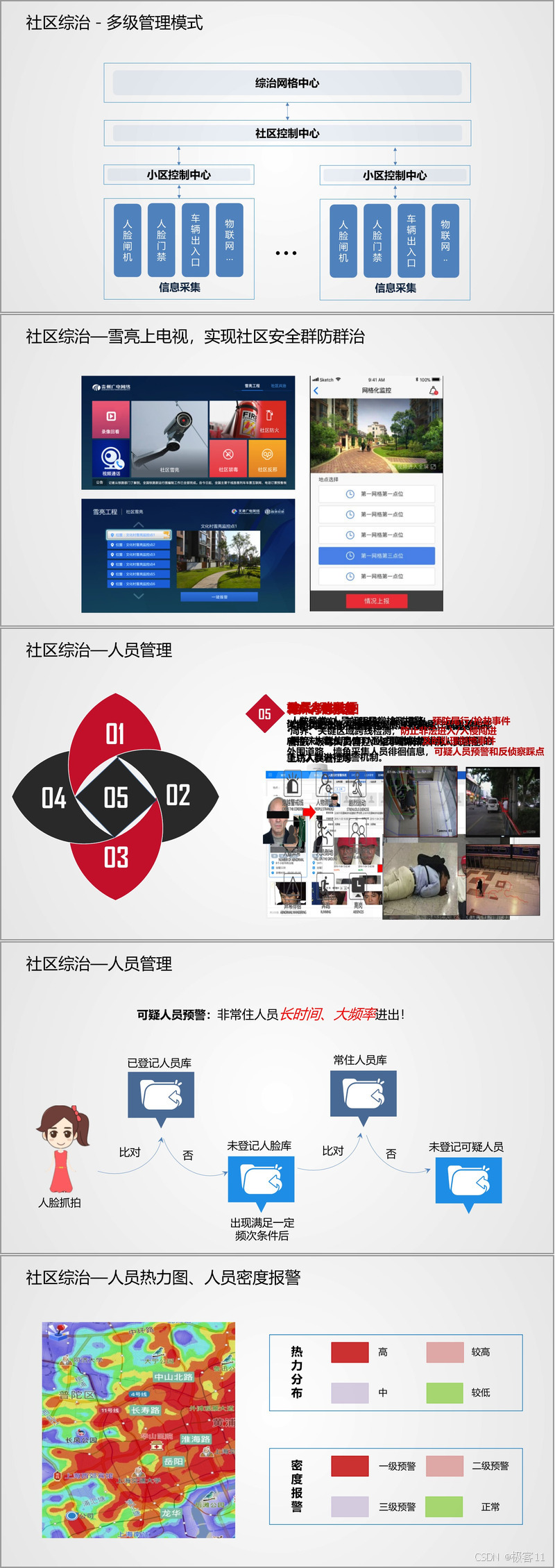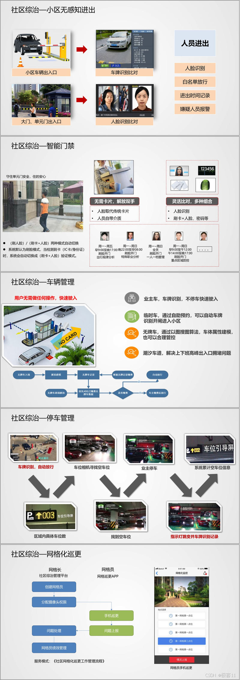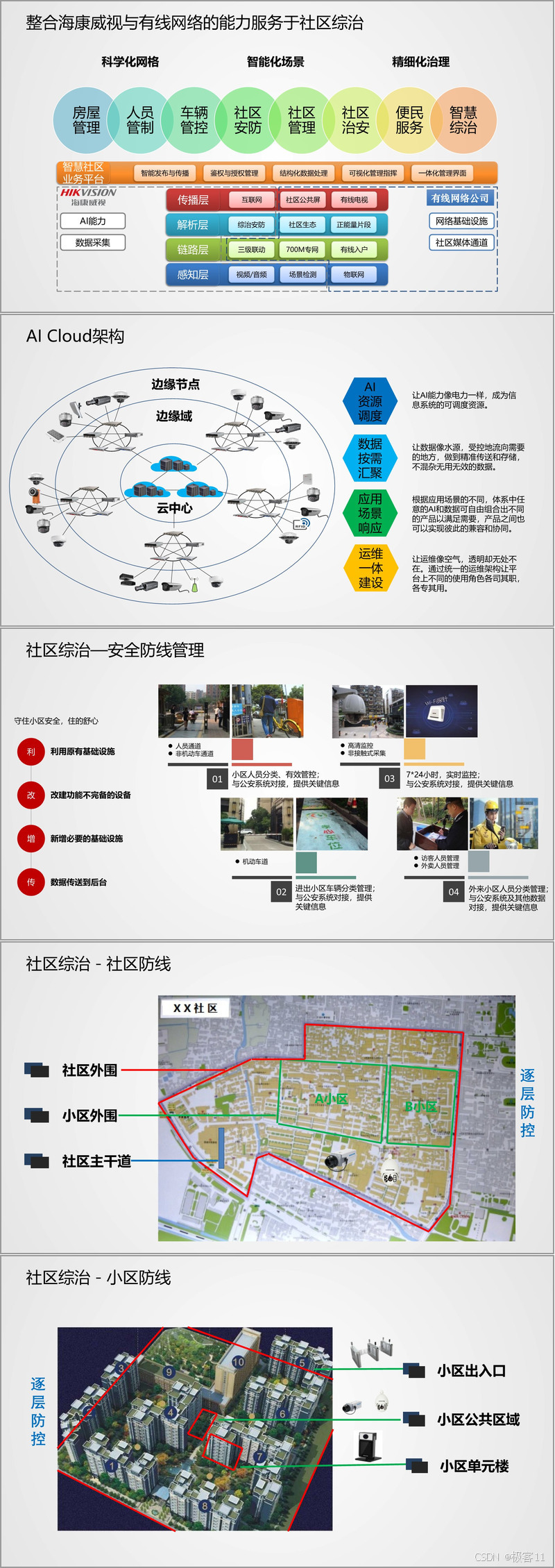 在具体建设内容上,智慧综治整合海康威视与有线网络能力,实现科学化网格、智能化场景和精细化治理。通过雪亮上电视,让居民参与社区安全群防群治;对独居老人关怀、重点人员管控、重点人群服务和老人小孩找回等,体现了社区的人文关怀和安全保障。在人员和车辆管理上,实现无感知进出、智能门禁和停车管理,提高社区通行效率。