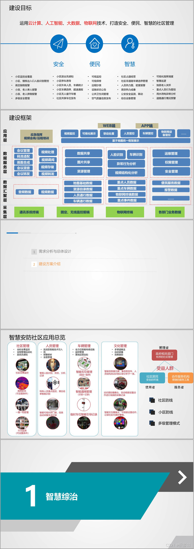 该方案的总体设计包括采集层、数据汇聚层、数据服务层和应用层。采集层负责收集视频、物联网等各类数据;数据汇聚层对数据进行整合;数据服务层为应用层提供数据支持;应用层则涵盖人脸识别、车辆识别、异常行为分析等多种应用。同时,通过智能信息展示屏、摄像头等设备,实现社区信息的发布和记录,服务于社区居民、管理者和政府部门。