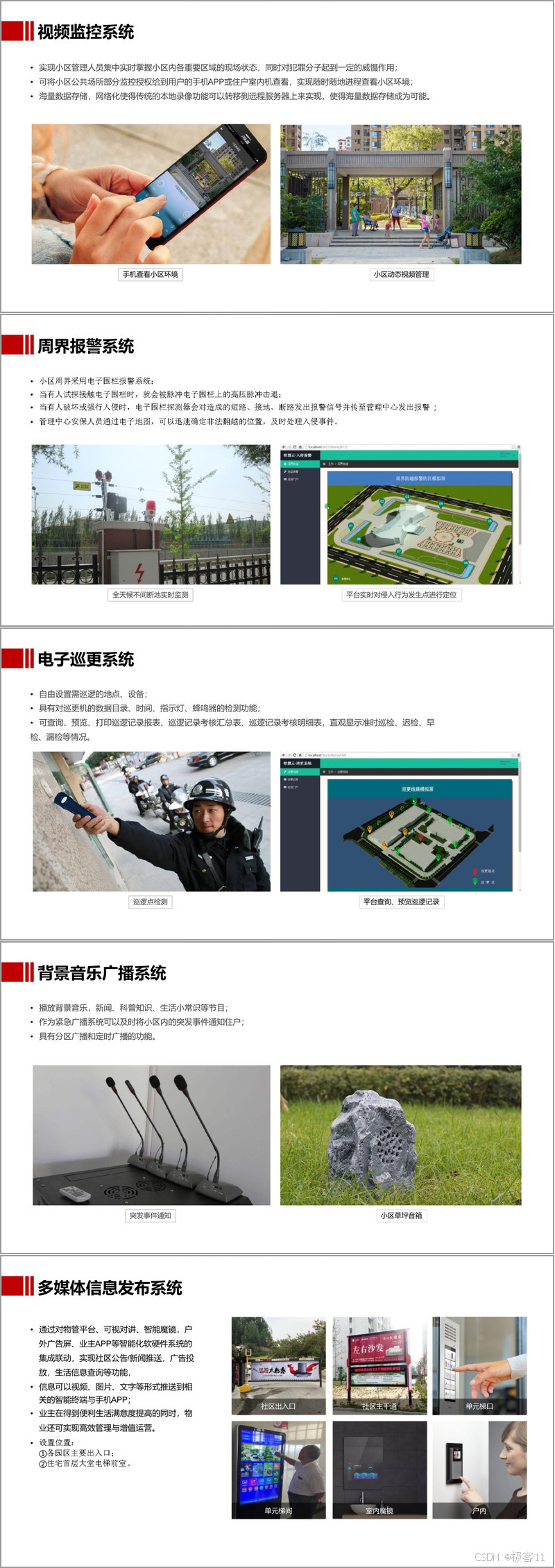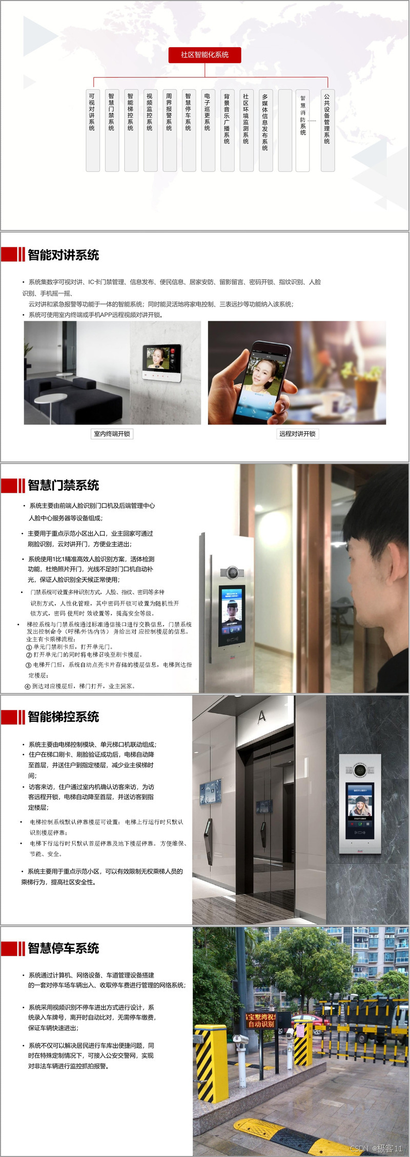 在具体的方案介绍中,智慧社区包含多个系统。社区智能化系统包含智慧停车、视频监控、可视对讲等多个子系统。其中,智能对讲系统集多种功能于一体,可实现远程视频对讲开锁;智慧门禁系统设置多种识别方式,提高安全性,且与梯控系统联动;智慧停车系统采用视频识别不停车进出方式,还可接入公安交警网;视频监控系统能让管理人员实时掌握小区情况,部分监控还可授权给用户查看。智慧社区管理平台具有统一管理、灵活配置、3D 图形化展示等特性,实现设备管理、收费管理、广告运营管理等多种功能,还具备预警联动机制,能在异常情况发生时及时响应处理。智慧物业通过物业 APP 实现多种功能,如报警通知、收费管理、业主管理等,方便物业人员工作和业主生活。智慧生活则通过业主 APP,让业主实现便捷开门、智能家居控制、智能安防等功能,享受更加智能化、便捷化的生活。