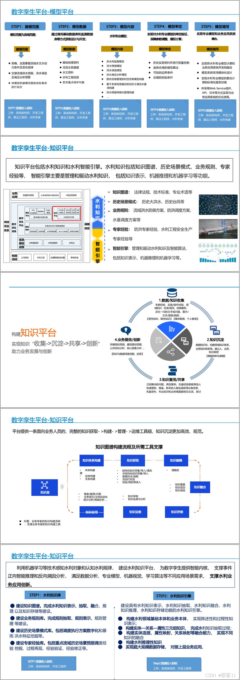 - 数字孪生平台:由数据底板、模型平台、知识平台构成,为水利业务提供仿真推演能力。其中,数据底板通过多源数据(如GIS、BIM、遥感影像)构建全域水系数字模型;模型平台集成水利专业算法(如洪水预报、水质模拟);知识平台则沉淀专家经验与历史案例,辅助决策。