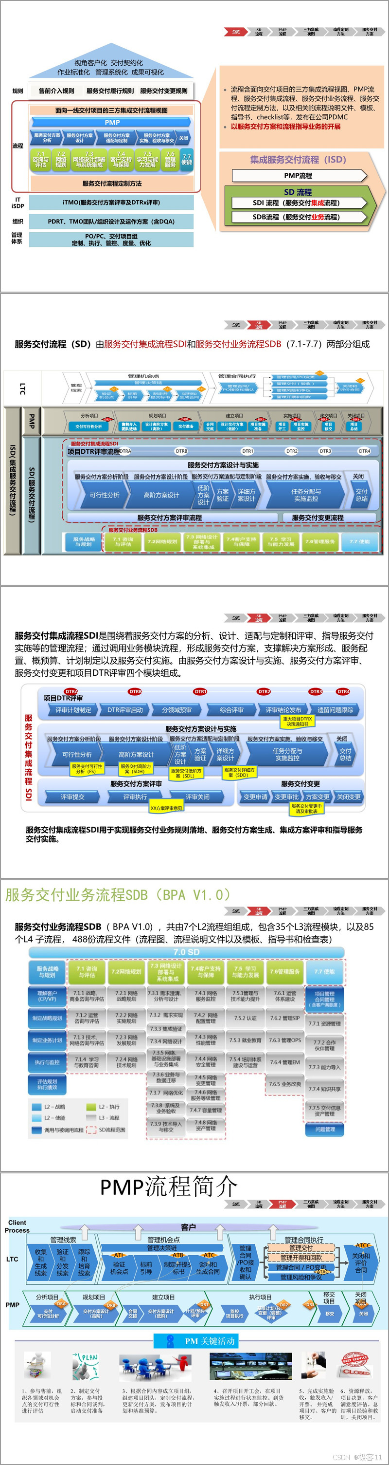 - 集成服务交付流程(ISD):包含服务交付流程(SD)与项目管理流程(PMP),其中 SD 流程细分为咨询评估、网络规划、系统集成等 7 大模块,覆盖交付全生命周期。