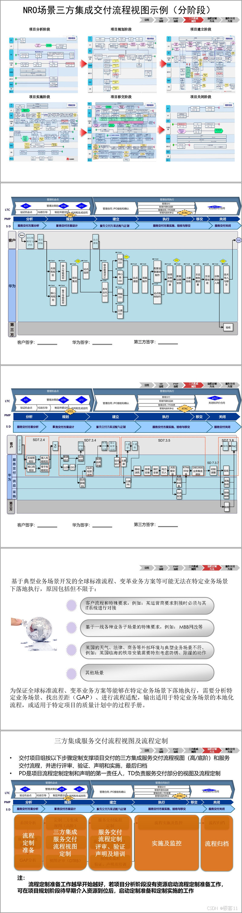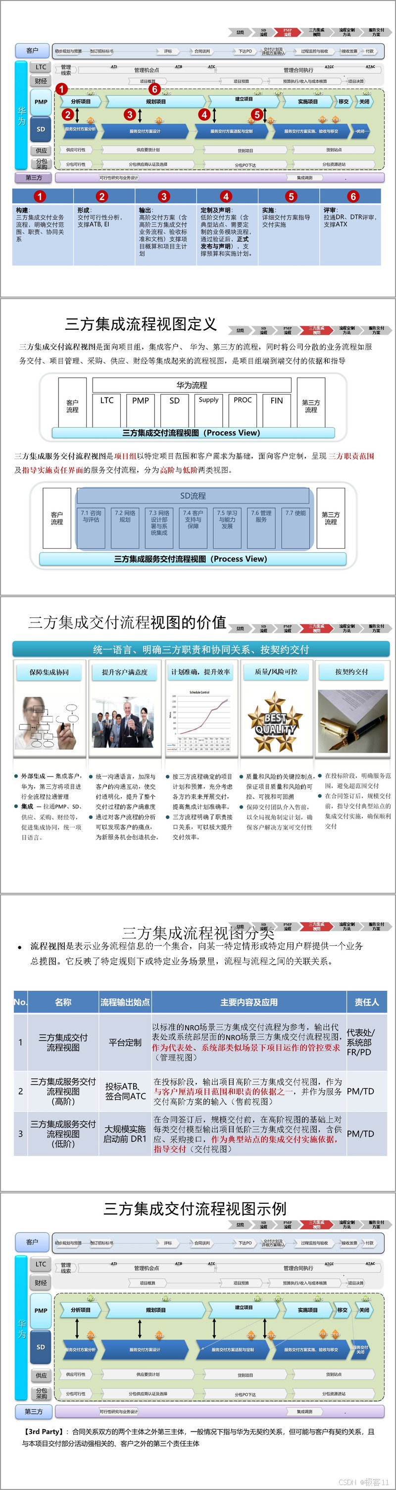 - 三方集成流程视图:面向客户、华为、第三方构建端到端流程视图,分为高阶(售前澄清范围)与低阶(交付实施指导)两类,明确三方职责边界与协同机制,例如无线 TK 项目的站点获取、设备安装及验收流程均通过三方视图拉通管理。