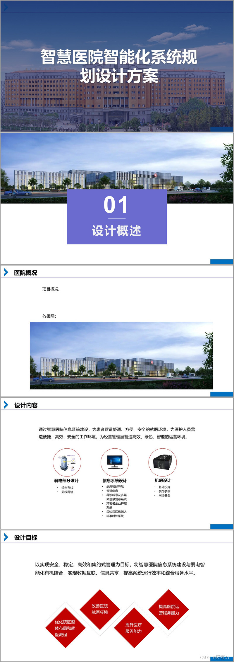 方案首先对医院项目概况进行说明,涵盖院区布局、功能分区等基础信息。设计内容分为三大板块: