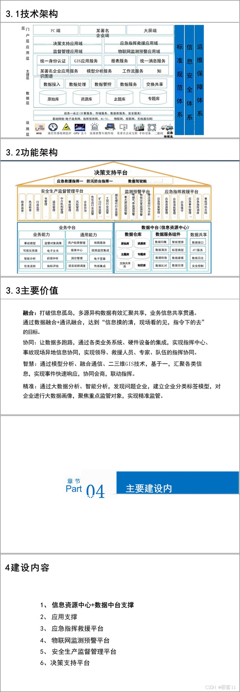 技术架构层面,方案构建了 “数据层 - 支撑层 - 应用层 - 门户层” 的分层体系。数据层通过原始库、资源库、主题库、专题库的建设,实现多源异构数据的归集与治理;支撑层提供统一身份认证、GIS 应用、模型分析等基础服务,为业务应用提供技术支撑;应用层涵盖监督管理、应急指挥救援、物联网监测预警等核心模块,实现业务的数字化与智能化;门户层通过 PC 端、移动端、大屏端等多终端适配,满足不同用户的使用需求。功能架构方面,方案以数据中台与业务中台为核心,构建 “监测预警 - 应急指挥 - 决策支持” 的闭环体系。监测预警平台实现对安全生产与自然灾害的实时监测与分级预警;应急指挥救援平台整合应急资源、预案、演练等功能,实现事件的全流程管理;决策支持平台通过大数据分析、三维可视化等技术,为领导提供动态化、可视化的决策依据。方案强调 “融合、协同、智慧、精准” 四大价值:通过数据与通信的融合打破信息孤岛,通过业务系统与硬件设备的集成实现跨部门协同,通过模型分析与智能技术提升响应能力,通过大数据画像实现精准监管。