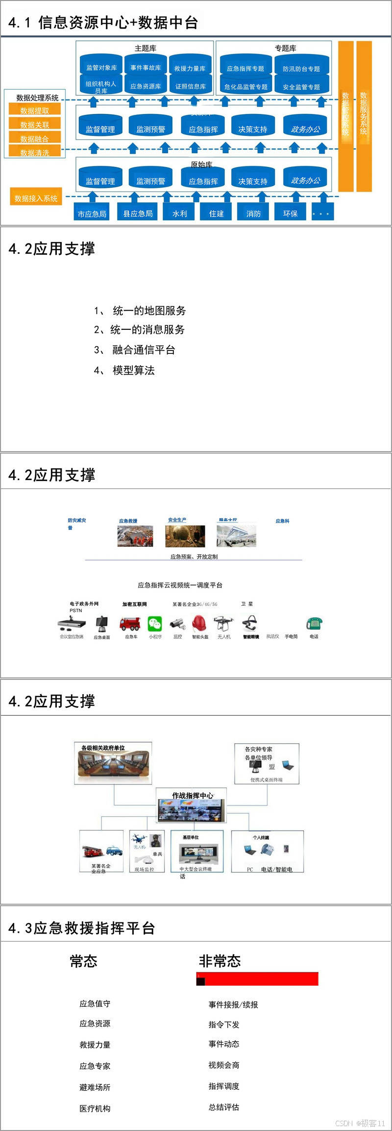 - 应用支撑:包括统一地图服务、消息服务、融合通信平台及模型算法等,实现技术能力的标准化与复用化,降低业务应用的开发成本。
