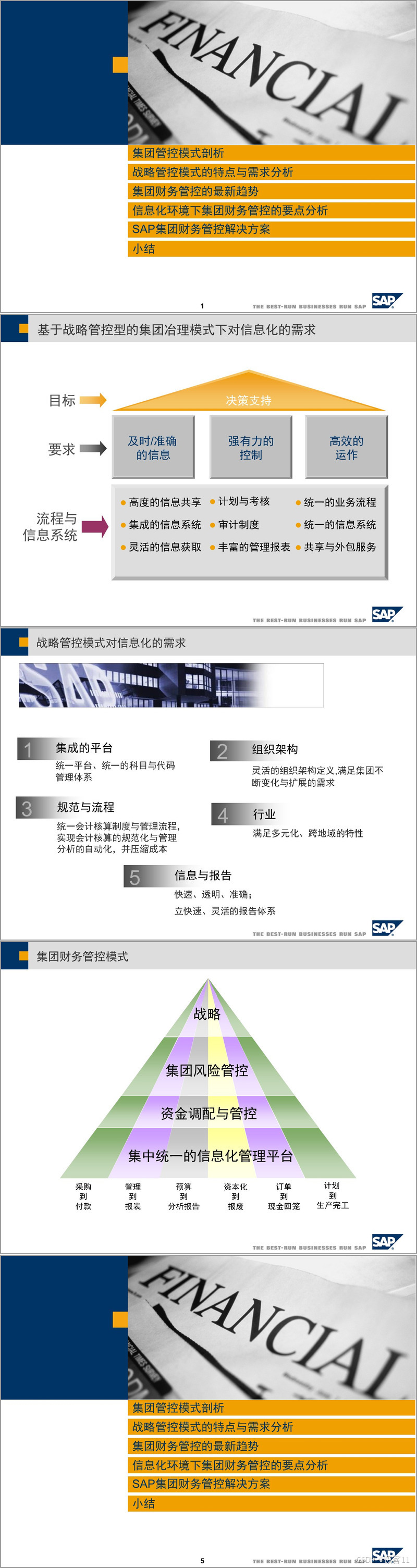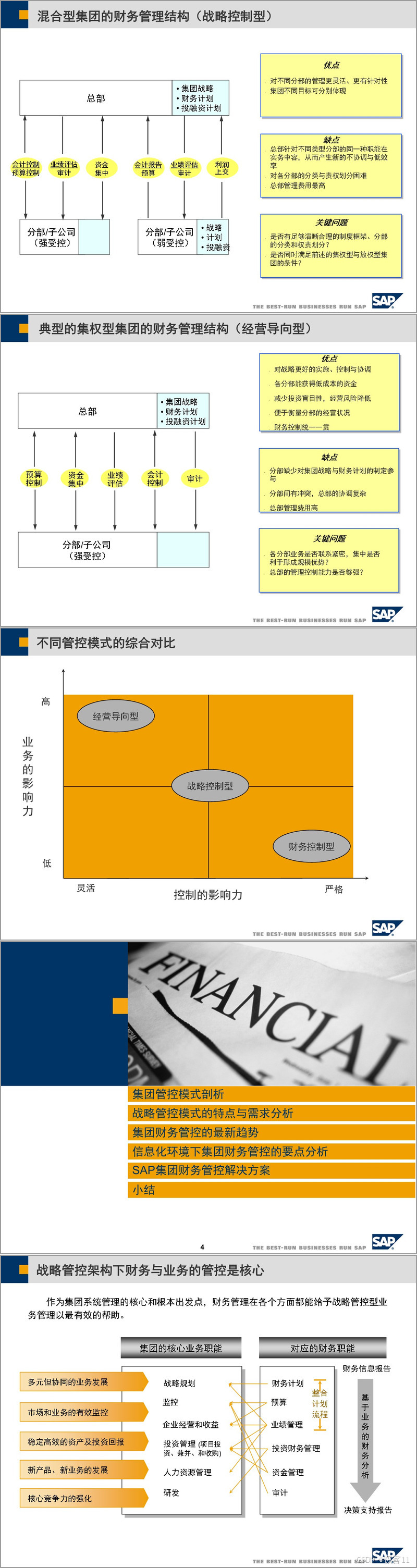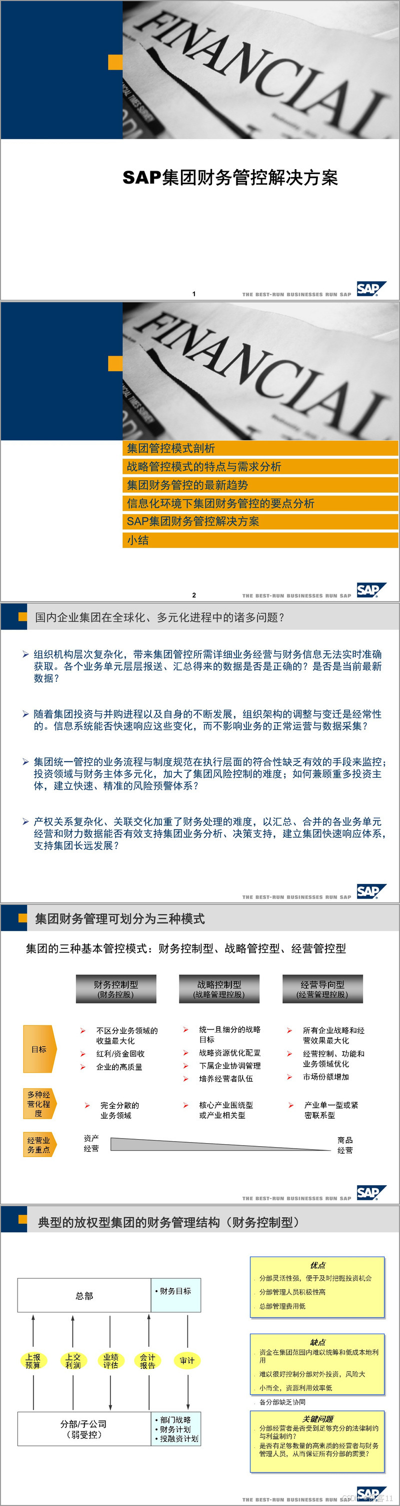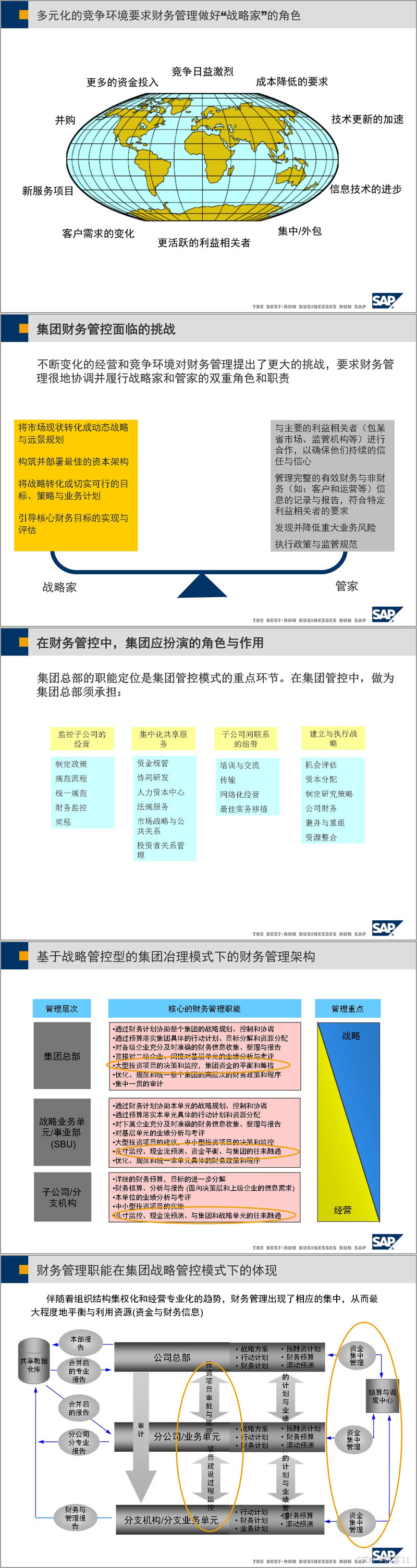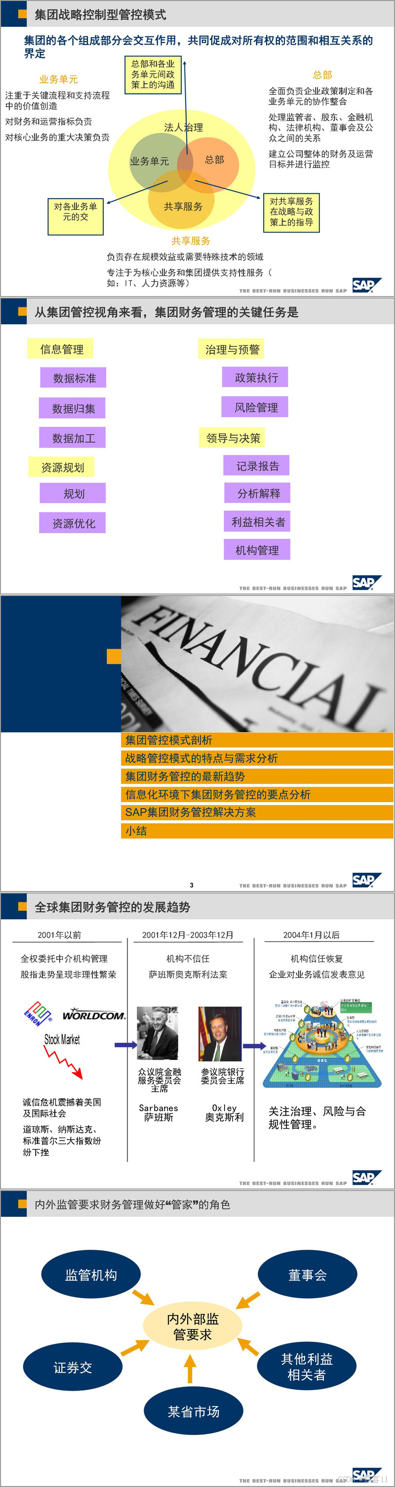总的来说,这份文档全面展示了SAP在集团财务管控领域的深厚积累。其解决方案不仅覆盖了财务管理的各个环节,更将先进的管理理念转化为可落地的系统功能。对于正在寻求财务管理转型的企业集团而言,这些经验无疑具有重要的参考价值。