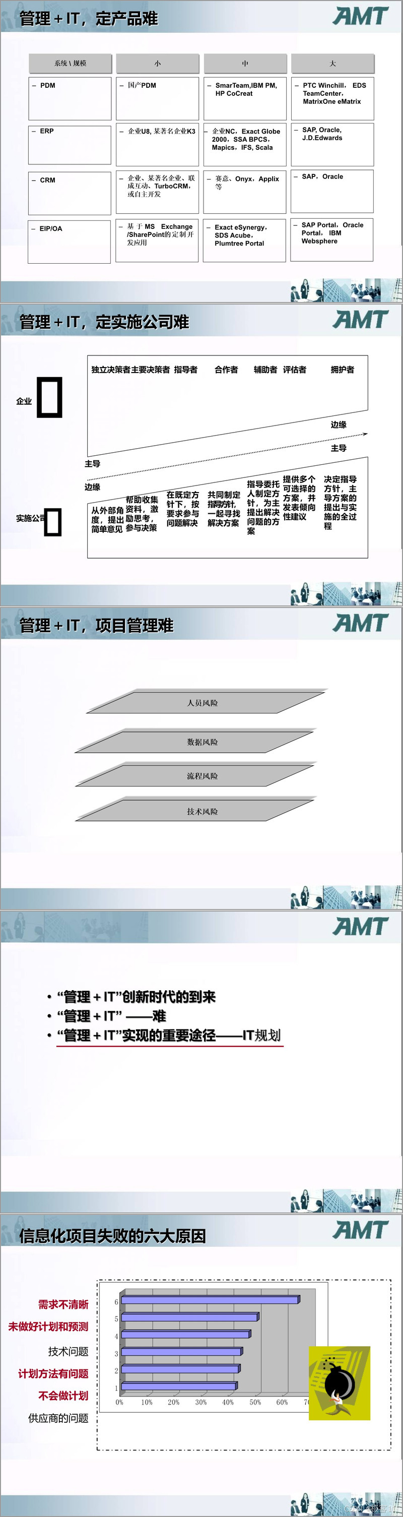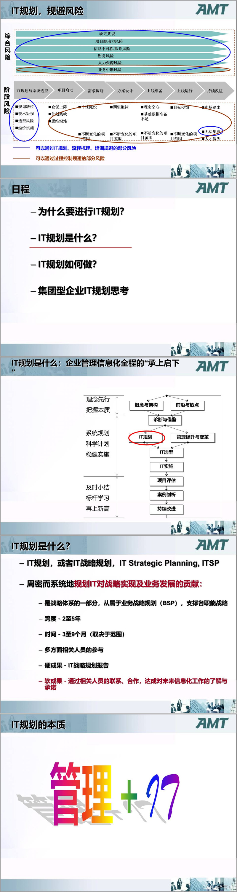 - IT规划是企业战略落地的关键桥梁,必须坚持"管理+IT"的融合视角