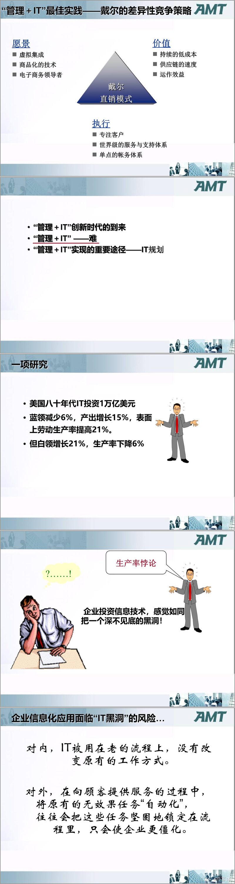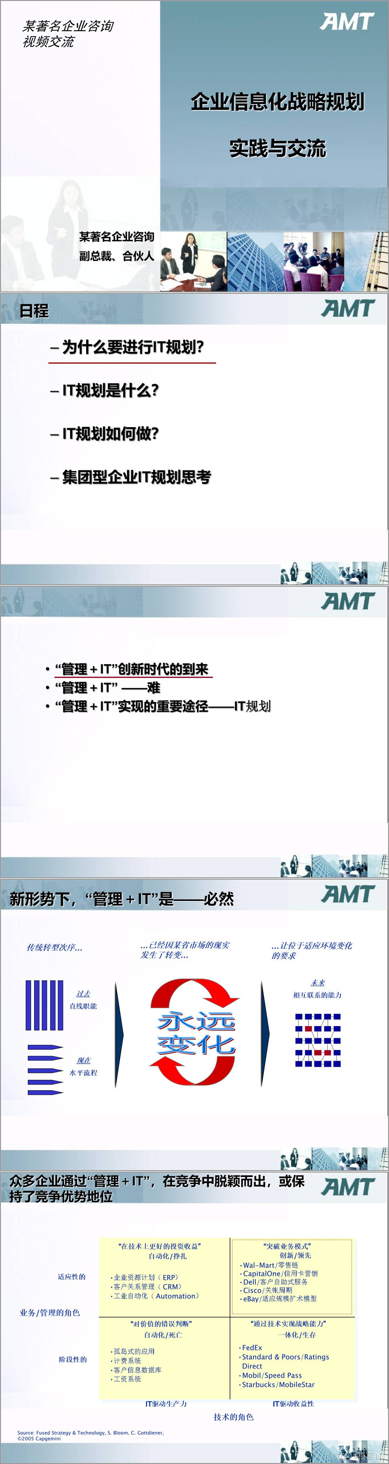 资料开篇即点明IT规划的核心命题——"管理+IT"创新时代的到来。这一理念揭示了现代企业运营中管理与信息技术深度融合的必然趋势。正如资料所示,众多领先企业如戴尔、沃尔玛、Capital One等,正是通过"管理+IT"的有效结合,在各自领域建立了差异化竞争优势。