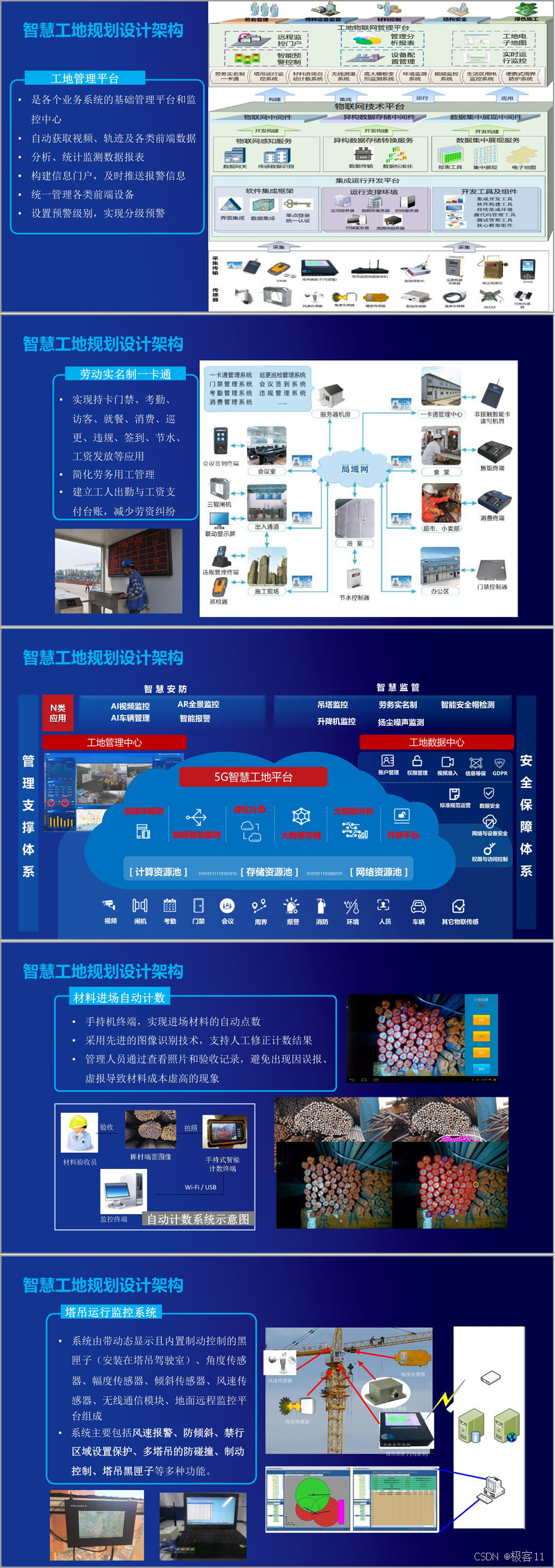 在规划设计上,智慧工地平台构建了 “云 - 边 - 端” 一体化架构。底层依托计算、存储、网络资源池,提供弹性算力与数据存储能力;中层通过流媒体服务、大数据分析等模块,实现数据的汇聚与智能处理;上层则聚焦智慧安防、劳务实名制、设备监控等 N 类应用,形成闭环管理。例如,塔吊监控系统由驾驶室黑匣子、各类传感器及地面平台组成,可实现防倾斜、防碰撞等多重保护;无线测温系统通过分布式传感器,24 小时监测混凝土温度变化,避免因温差过大引发爆裂。