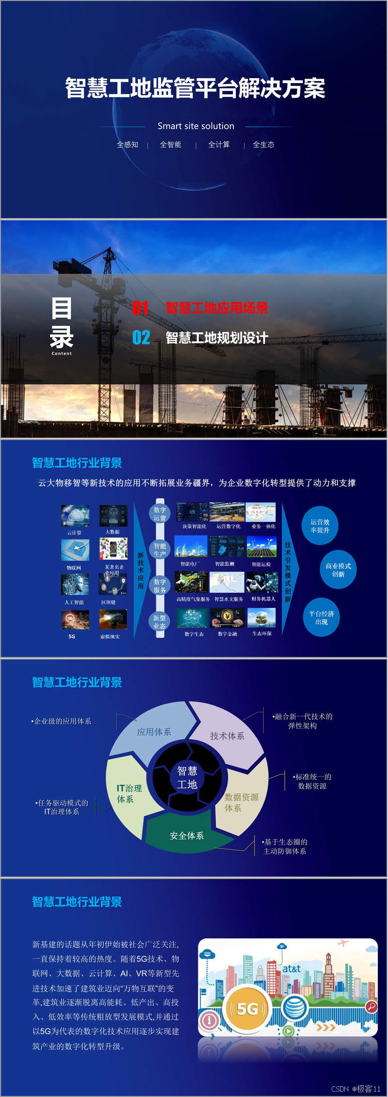 在 “新基建” 浪潮推动下,建筑业正加速向数字化、智能化转型,智慧工地监管平台成为这一进程的核心支撑。该方案以 “全生态、全感知、全计算、全智能” 为核心理念,融合 5G、云计算、大数据、物联网、人工智能等新技术,构建起覆盖工地全流程的智能化管理体系,旨在解决传统工地管理中的效率低下、安全隐患突出、环境监管不足等痛点。