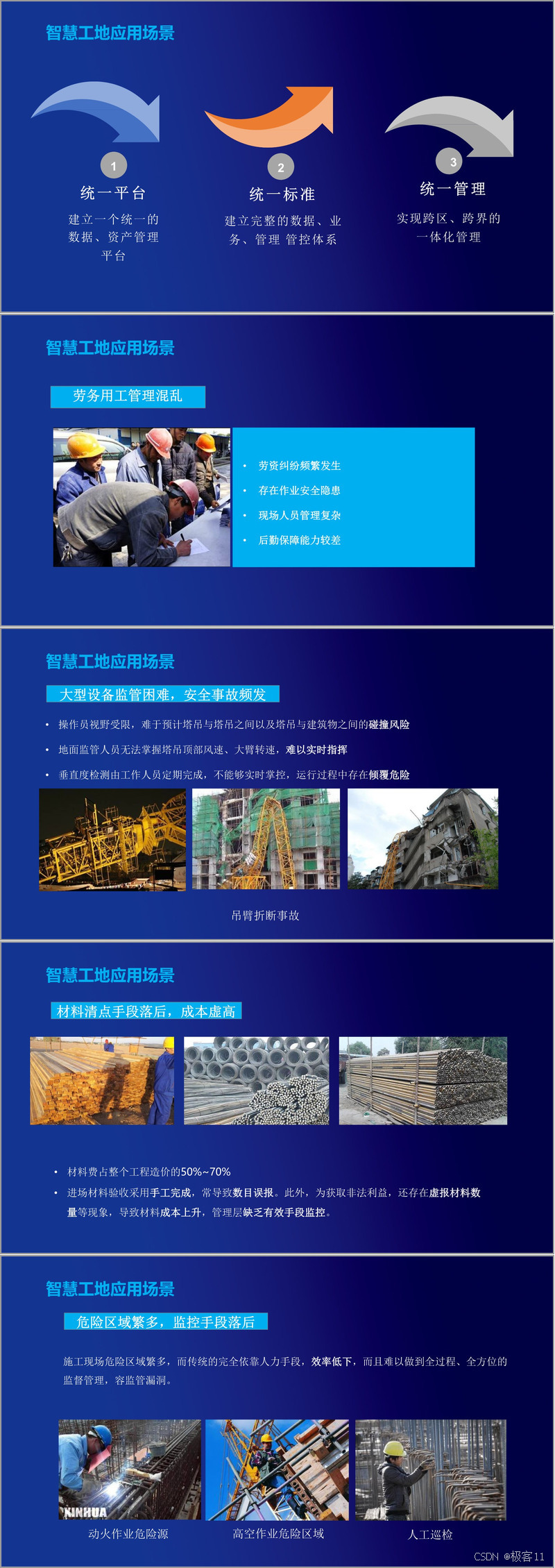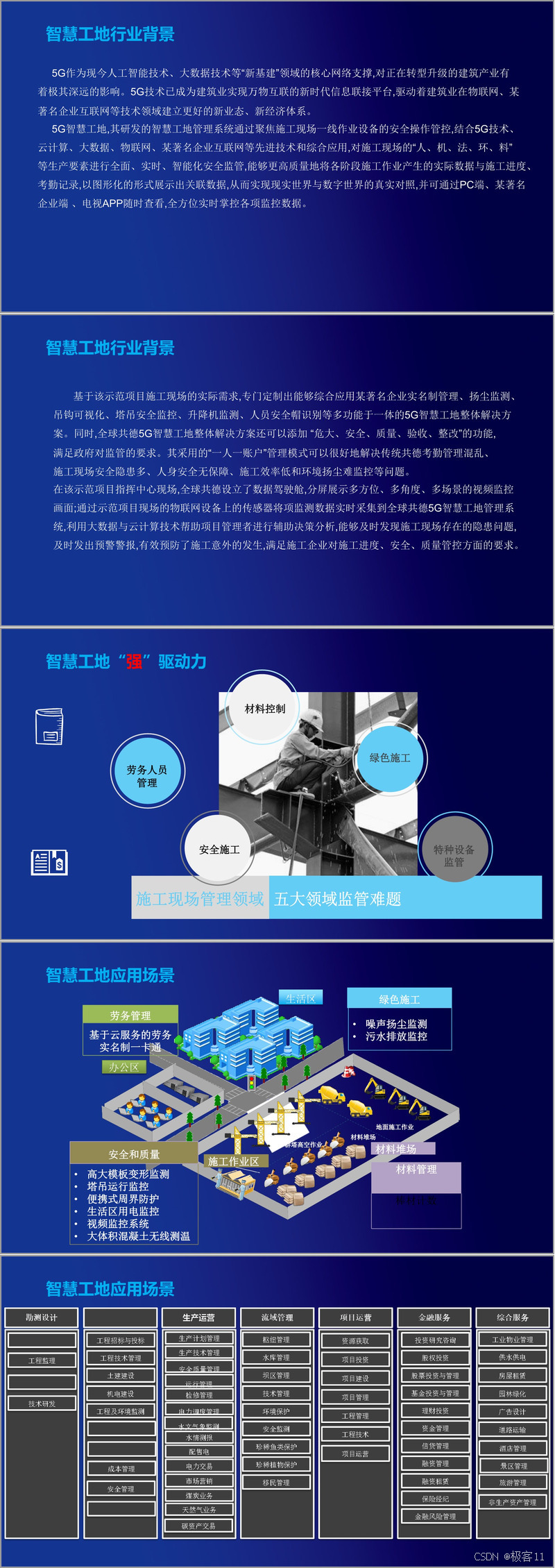 从行业背景来看,新技术的应用正重塑建筑业发展模式。5G 作为 “新基建” 的核心网络支撑,为工地 “万物互联” 提供了基础,使得施工现场的 “人、机、法、环、料” 等要素可被实时、全面感知。通过云计算与大数据技术,这些要素数据能被集中分析处理,转化为决策依据,推动施工管理从经验驱动向数据驱动转变。例如,某示范项目通过 5G 智慧工地管理系统,实现了施工进度、考勤记录等数据的图形化展示,管理人员可通过多终端实时掌控现场情况,大幅提升了管理效率。