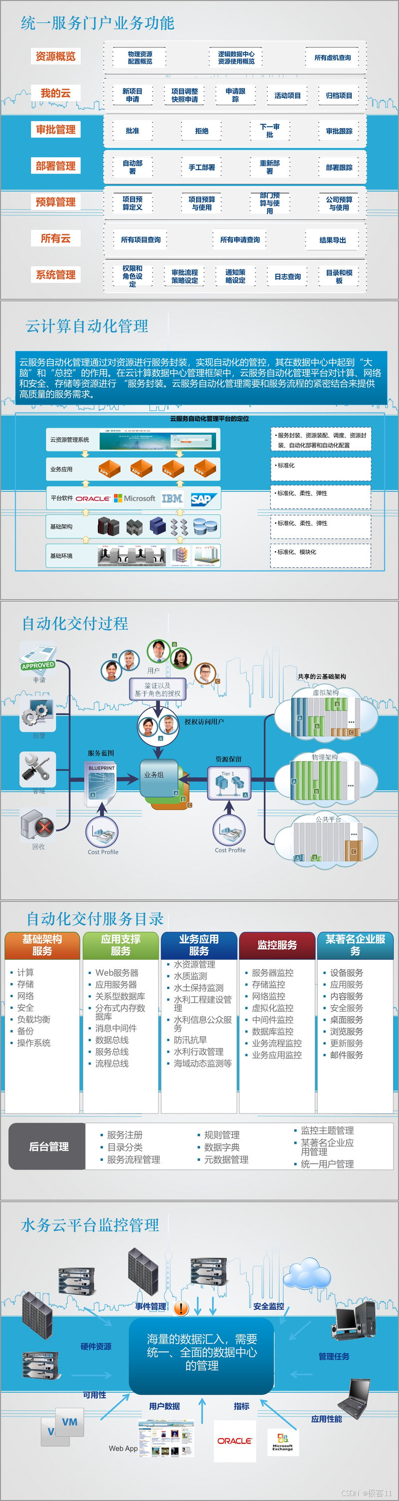 建设方案以 “整体设计、分步实施” 为原则,构建了 “基础架构 + 业务支撑 + 运维管理” 的多层次框架。在基础架构层面,采用软件定义的数据中心理念,通过服务器、网络、存储的虚拟化,形成弹性资源池,支持私有云、公有云与混合云的灵活部署,实现 IT 资源与水务业务的动态适配。在业务支撑层面,覆盖供水、排水、防汛、海域监视等核心场景,通过虚拟桌面、某著名企业应用等技术,提升跨部门协同效率。