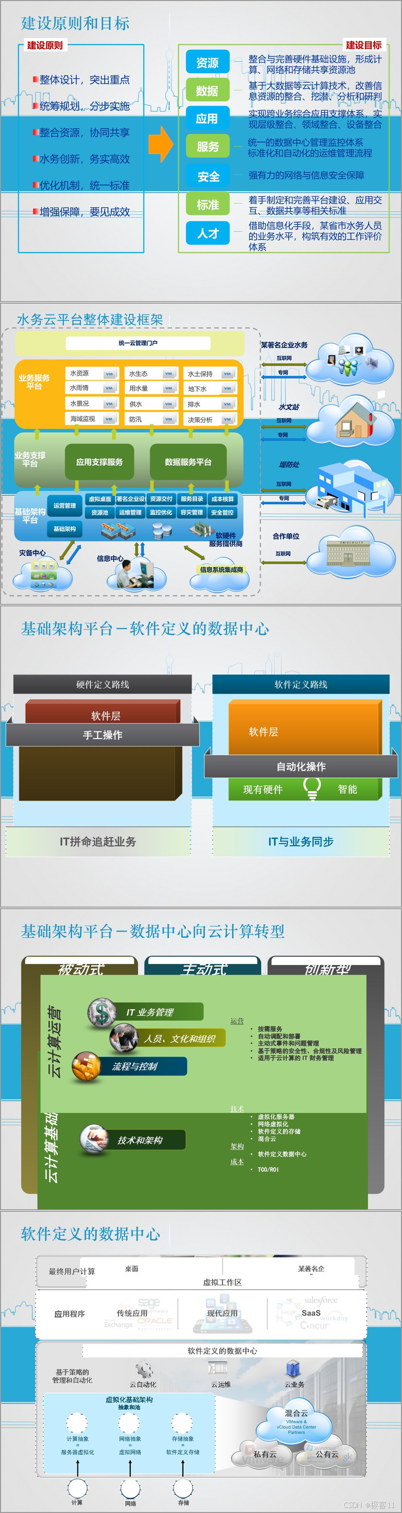 传统水务信息系统面临着显著挑战:竖井式架构导致业务系统协同不畅,资源无法灵活调配;IT 与业务节奏脱节,难以快速响应水务管理需求;数据分散、格式不一,制约了决策效率。为此,方案明确了四大建设方向:优化工作流程与机制,构建软件定义的数据中心,完善统一安全管理体系,整合信息资源以建立智慧决策体系。