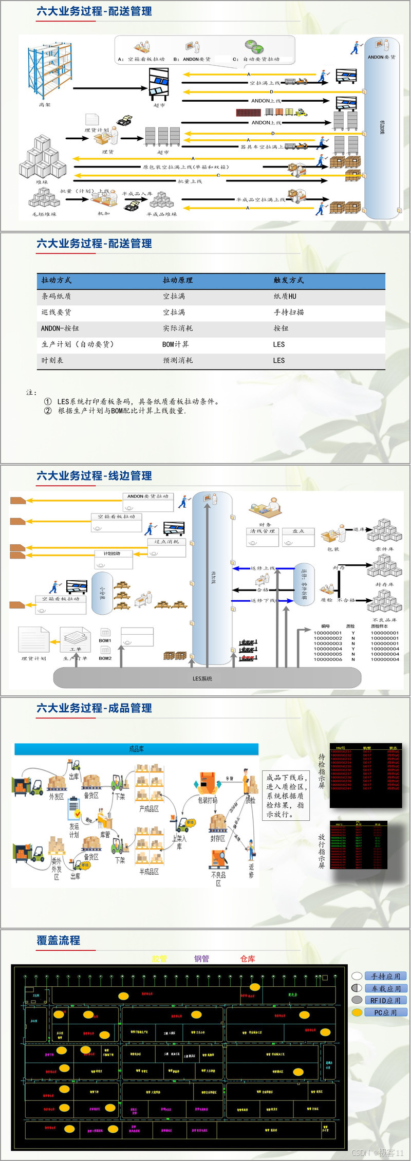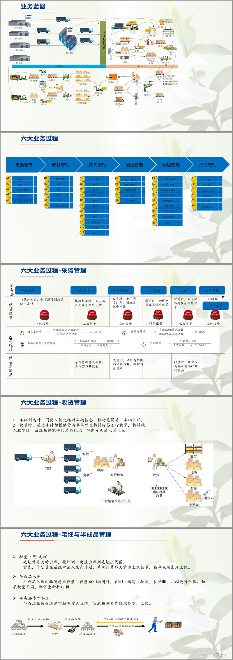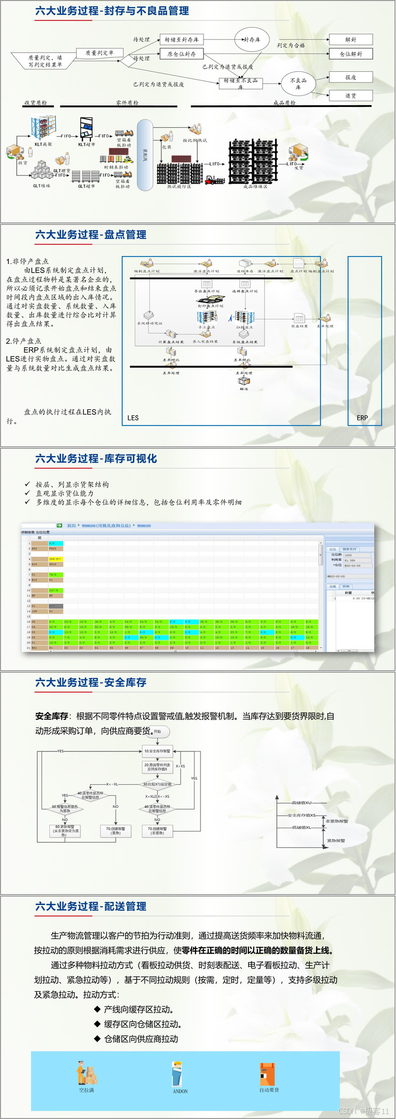 六大业务过程构成蓝图核心:采购管理实现从订单到供应商器具返还的全周期管控,通过多级报警机制确保供货时效与质量;收货管理通过门岗核验、手持扫描实现物料快速入库与质检分流;毛坯与半成品管理按生产计划实现批量上线与委外加工拉动;封存与不良品管理通过质量判定单实现状态追溯与精准处置;盘点管理支持非停产与停产两种模式,结合实盘与系统数据比对生成差异结果;配送管理创新多种拉动方式,包括空拉满看板、ANDON 按钮、生产计划自动要货等,确保物料按节拍精准上线。