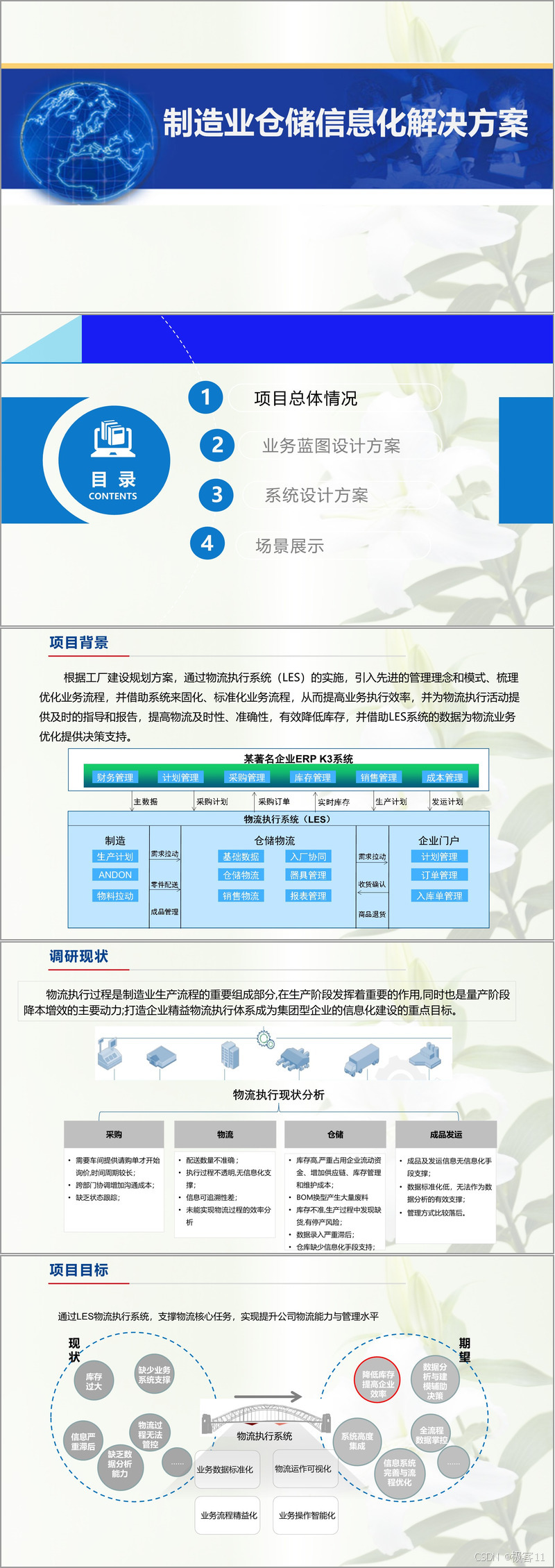 从项目背景来看,制造业物流执行环节普遍面临效率瓶颈:采购周期长且跨部门协调成本高,配送数量不准且过程不透明,库存积压严重且数据滞后,成品发运缺乏信息化支撑。为此,方案提出通过 LES 系统实施,梳理并固化业务流程,提升物流及时性与准确性,降低库存成本,并为决策优化提供数据支持,形成 “流程精益化、数据标准化、运作可视化、操作智能化” 的四大目标。