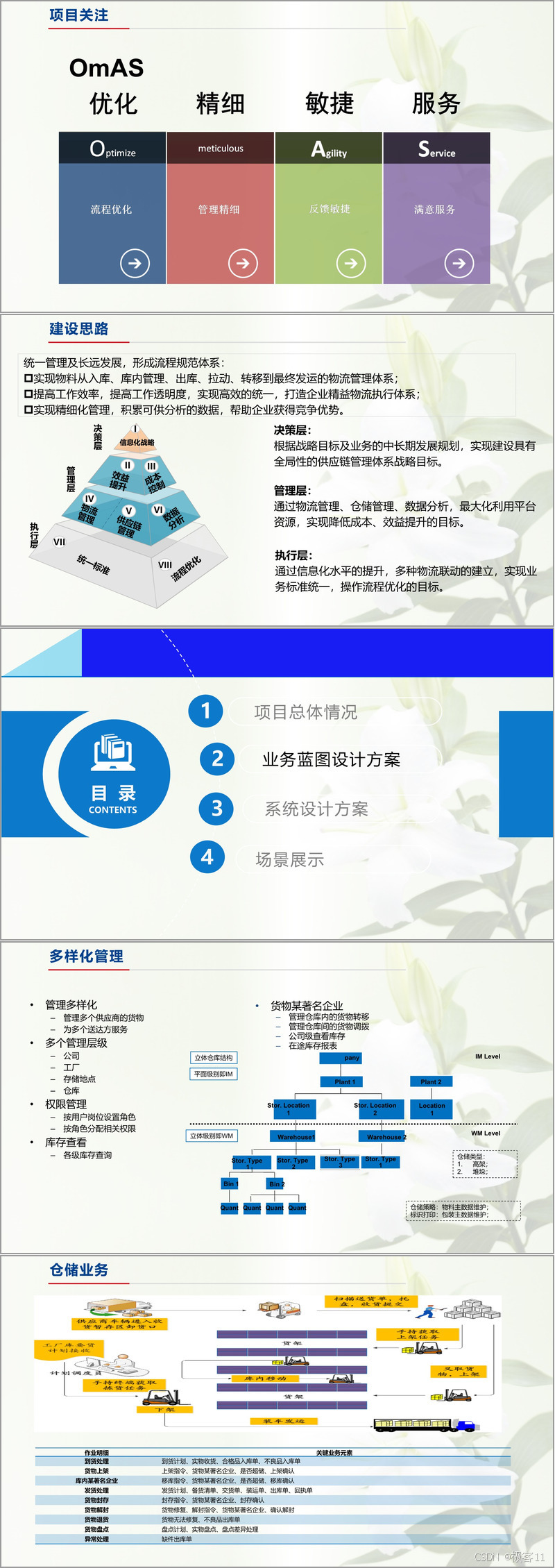 业务蓝图设计构建了全流程数字化框架。在多样化管理层面,支持多仓库、多供应商协同,按角色分配权限,实现公司级、工厂级、仓库级的库存分层可视化。仓储业务涵盖到货处理、上架、库内移动、发货处理等核心环节,明确各环节的关键元素,如到货处理需关联到货计划与收货单,上架需遵循指令与超储预警。