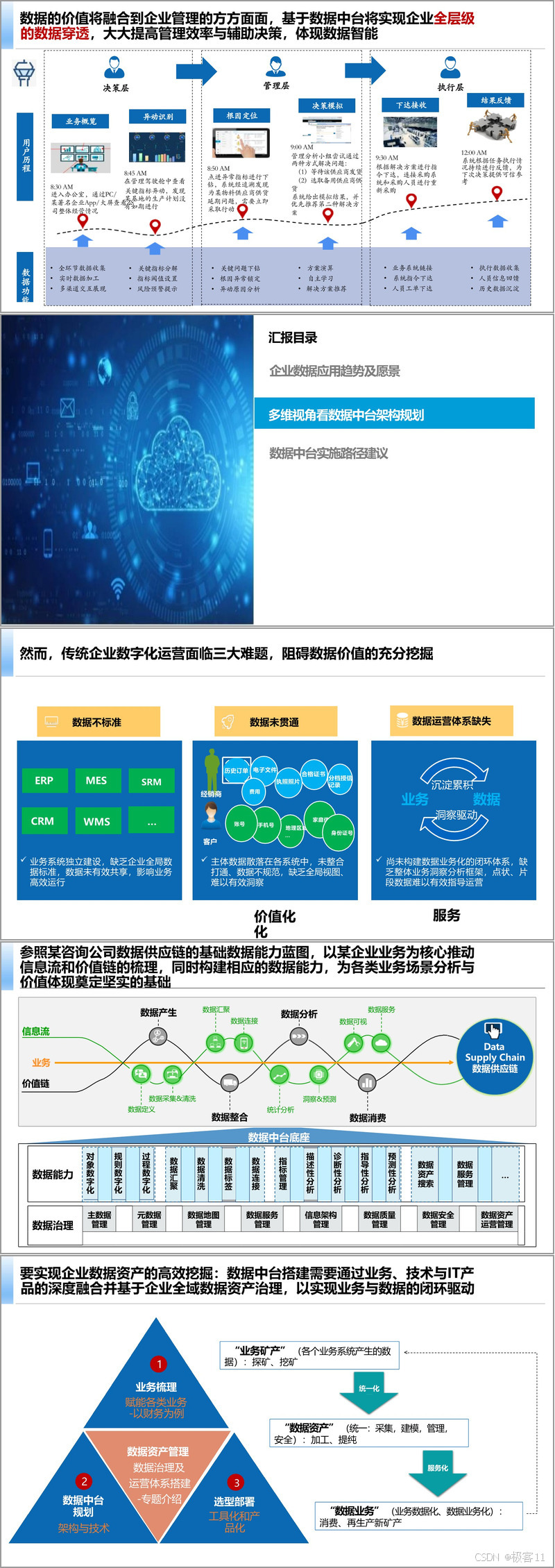 该文件深入分析了传统企业数字化运营面临的难题。例如,数据不标准,不同业务系统的数据格式、定义存在差异,导致数据难以整合与分析;数据未贯通,各部门数据相互孤立,形成数据孤岛,无法发挥数据的整体价值。基于这些问题,文件提出了基于数据供应链的数据能力蓝图,强调业务、技术与 IT 产品需深度融合。只有这样,才能打破数据壁垒,让数据在企业内部自由流动,为业务决策提供有力支持。