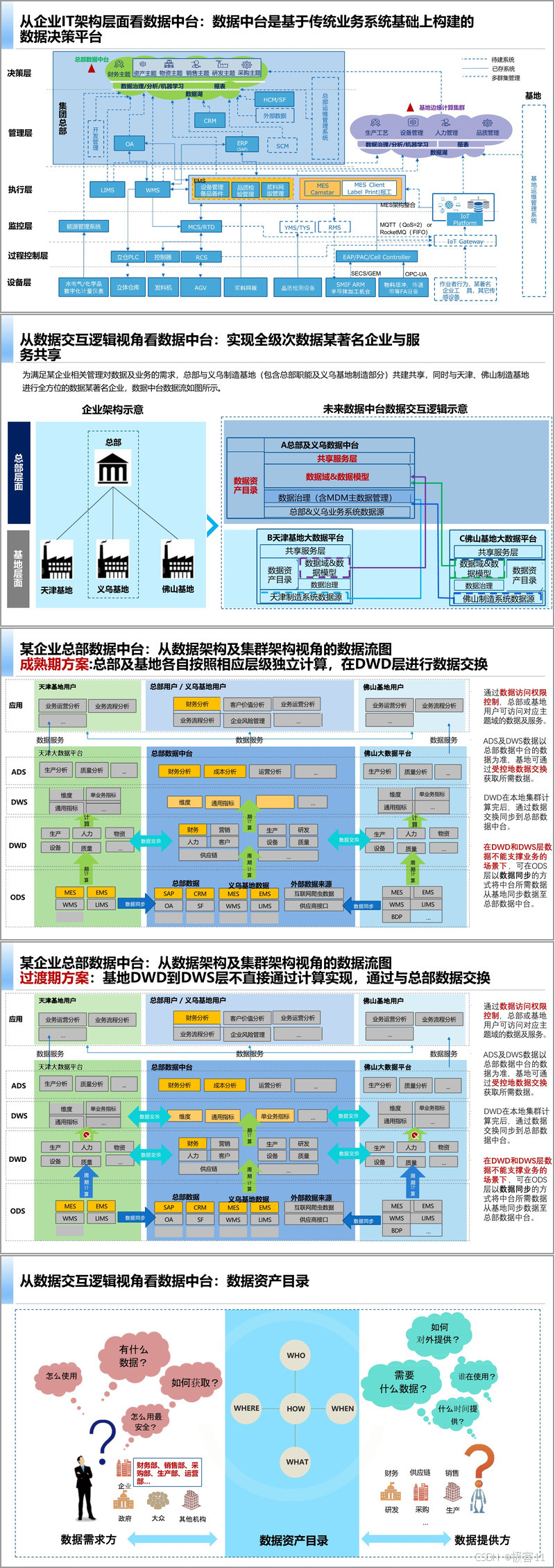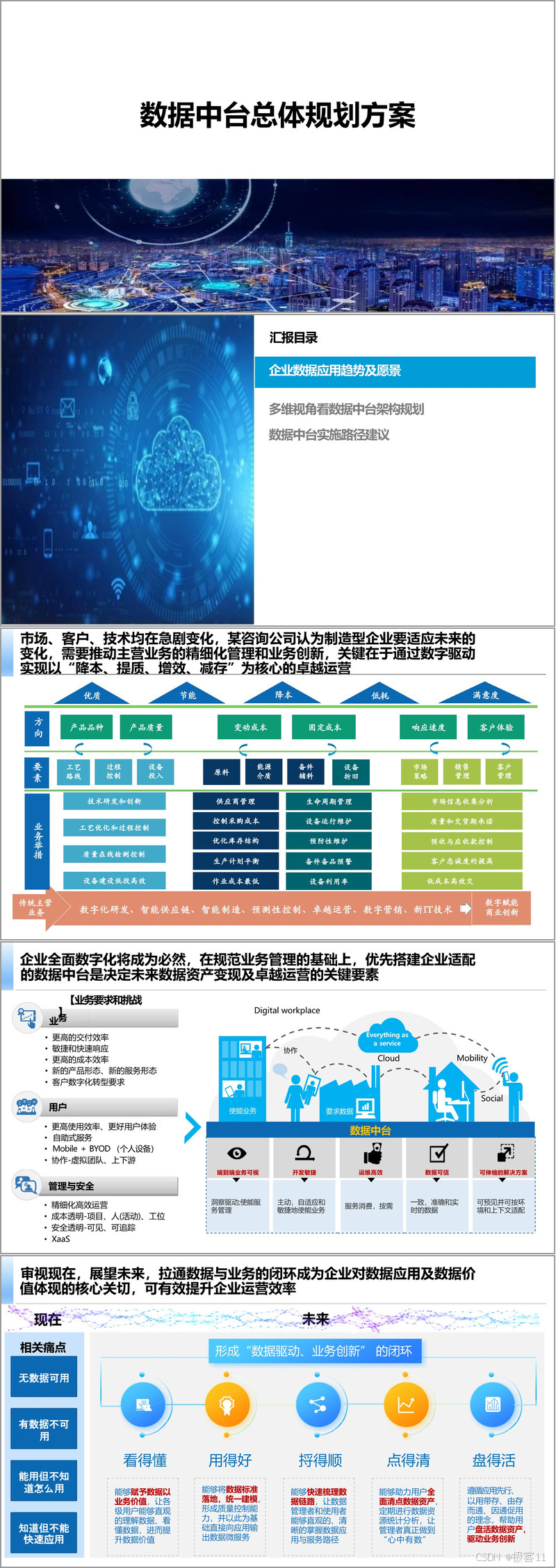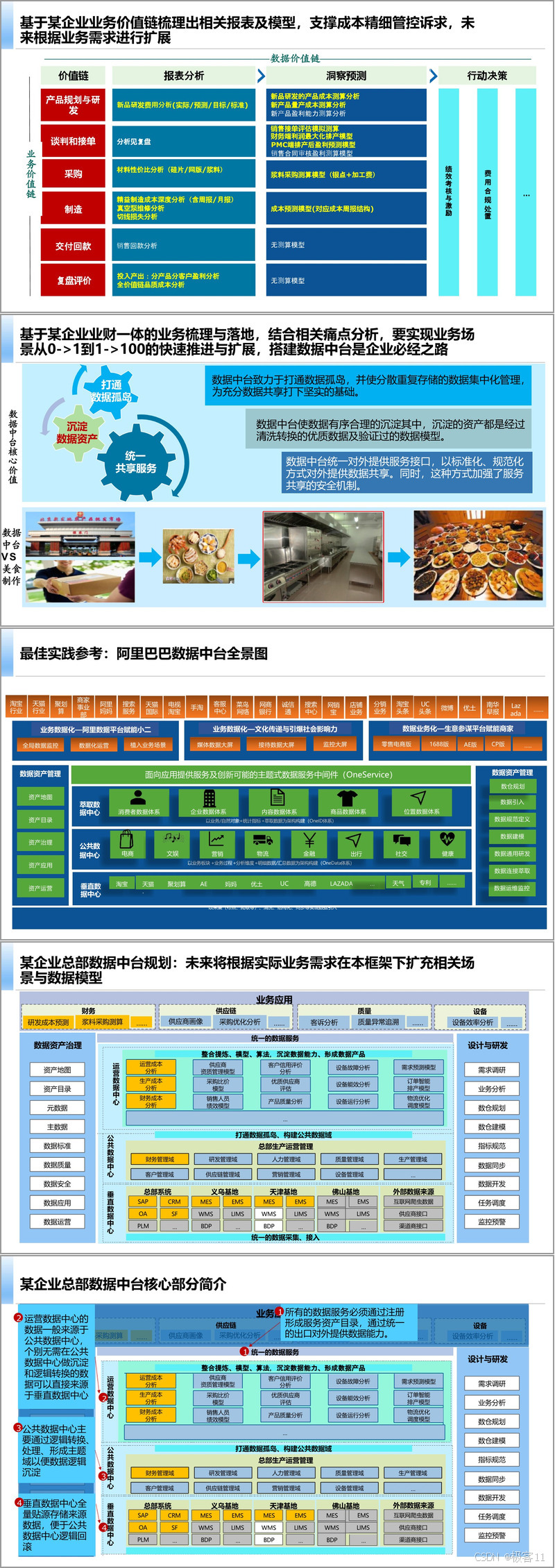 文件展示了某企业总部数据中台的规划框架。在业务应用层面,数据中台需紧密贴合企业的各类业务场景,如营销、生产、供应链等,为其提供精准的数据支持,助力业务优化与创新。数据资产治理至关重要,它涵盖数据的标准化、元数据管理、数据质量监控等,确保数据的准确性、完整性和可用性,使数据成为真正有价值的资产。数据开发环节则负责对原始数据进行加工、处理,构建数据模型,为数据服务提供基础。