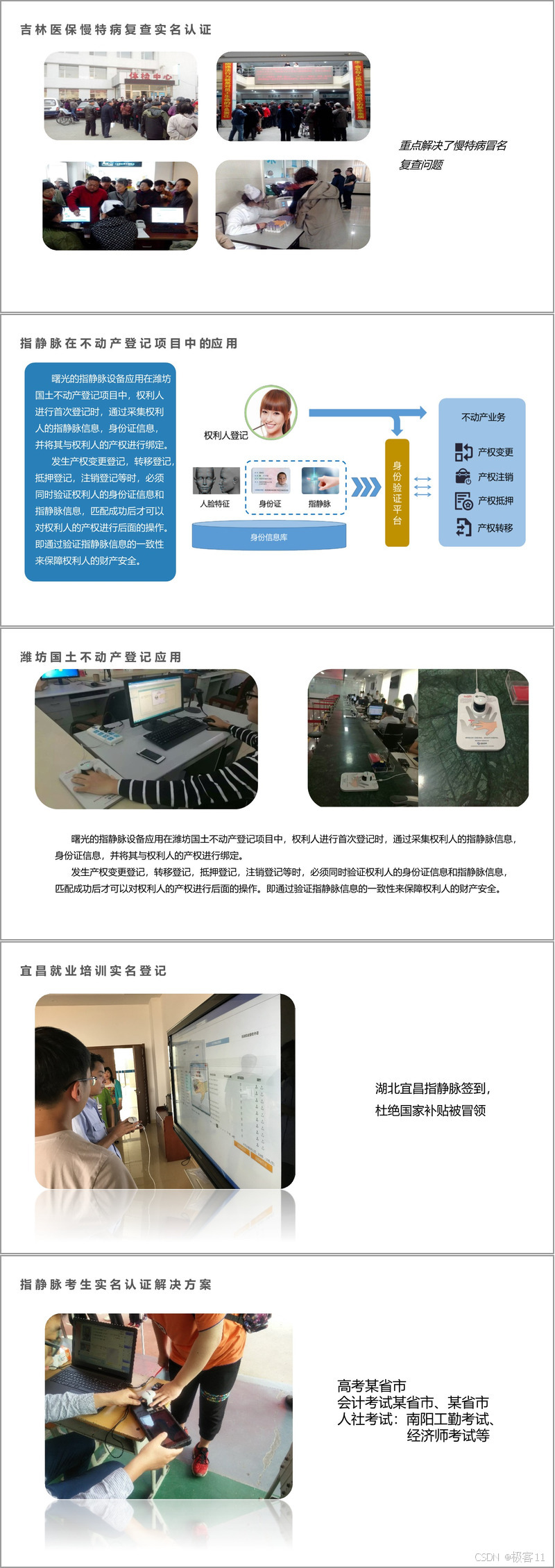 在实际应用中,方案覆盖人社全业务场景。在养老保险领域,通过经办机构终端、自助一体机等设备,实现待遇领取资格认证,如内蒙古 12 个盟市全面接入,累计认证 400 万人次,杜绝冒领问题;在医疗保险领域,徐州、焦作等地应用于大病诊疗、无卡就医,解决冒名诊疗、虚假结算等问题,仅徐州透析患者实名认证就有效遏制了违规行为;在就业培训领域,宜昌通过指静脉签到,防止国家培训补贴被冒领;在考试认证领域,应用于高考、经济师考试等场景,确保考生身份真实。此外,该技术还延伸至不动产登记、会场签到等领域,如潍坊国土将指静脉与产权绑定,保障产权变更安全。