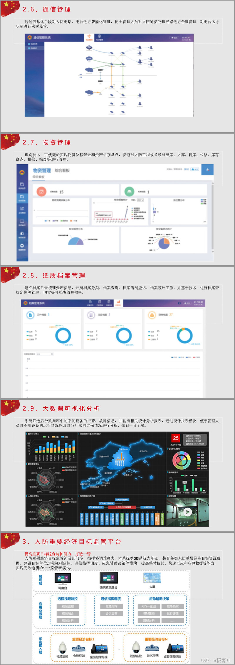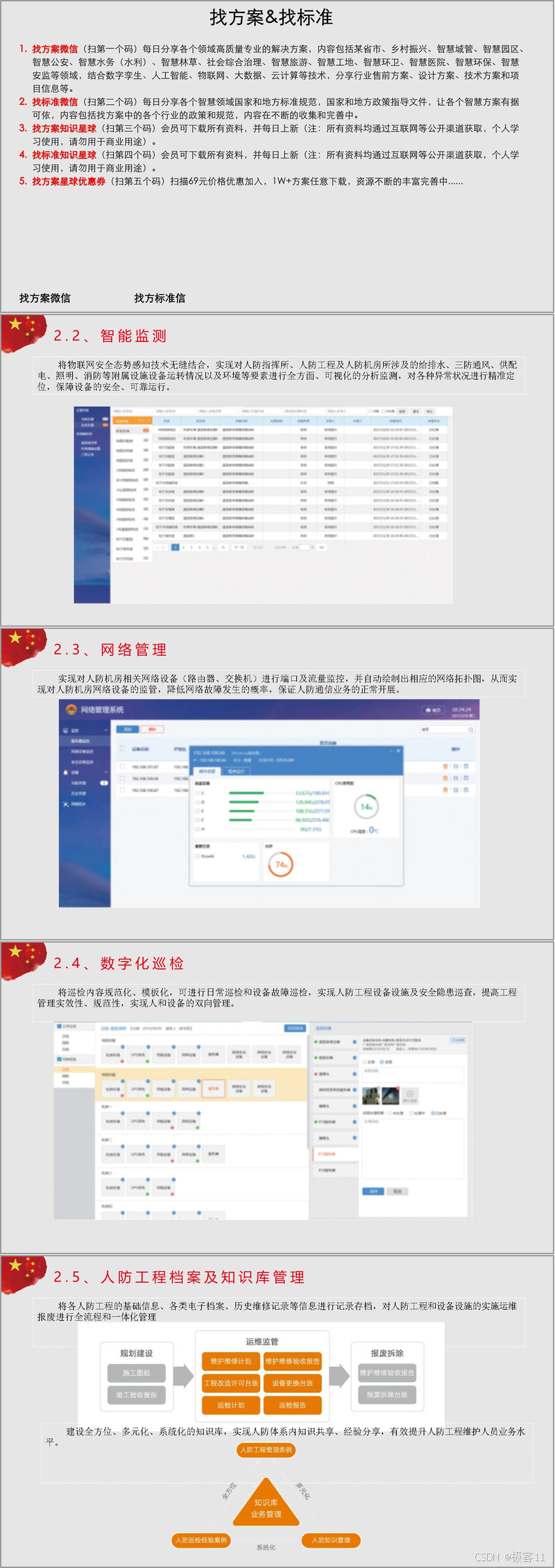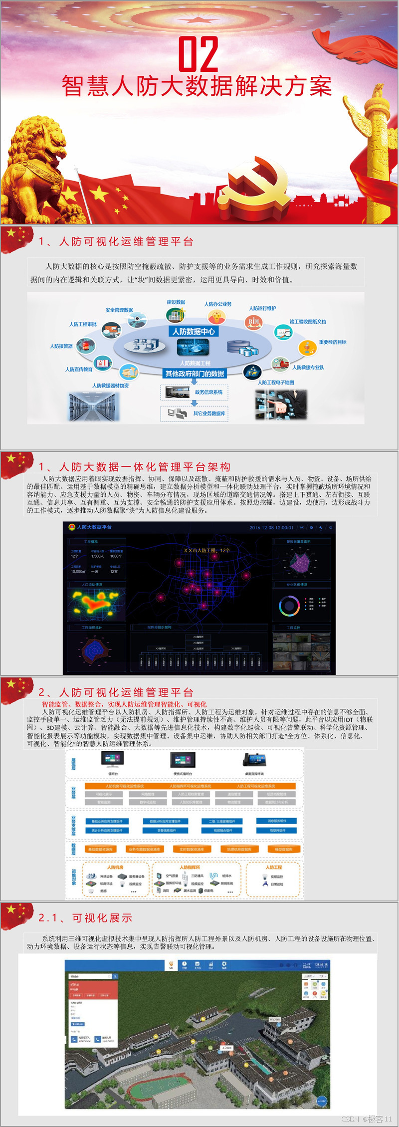 解决方案涵盖多个平台。人防可视化运维管理平台针对运维问题,应用多种先进技术,实现数字化巡检等功能,包含可视化展示、智能监测等模块。人防重要经济目标监管平台以 GIS 系统为基础,整合资源,建设远程视频监控等模块,提高防护和救援能力。人防桌面指挥系统采用智能终端,集多种功能于一体,方便领导办公与指挥。人防工程环境监测与设备监管系统基于网络和物联网技术,实现对环境和设备的监测与管控。人防多网系融合指挥调度系统依托专用网络,融合资源,实现多层级信息贯通,满足指挥和应急需求,包含音视频调度等模块。人防工程远程维护解决方案将自动化系统与互联网融合,实现远程维护管理。人防宣传教育体验平台突破传统模式,提供学习体验平台,包含多个应用场景和客户端。基于 BIM 和 IOT 的人防工程综合管理解决方案利用 BIM 技术优化工程建设与管理。