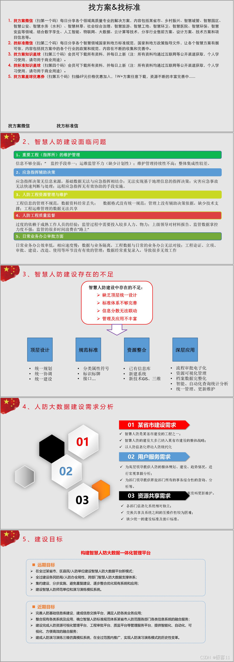 在需求与目标方面,某省市将智慧人防纳入整体战略,需满足高层领导宏观分析、部门领导事务查询、办事人员数据维护等用户服务需求,以及解决部门系统独立、共享困难等资源共享问题。建设目标是构建一体化管理平台,远期在全国相关单位推广新模式,形成支撑体系;近期完善信息库,整合系统,建成多个管理服务平台和仿真模拟系统。