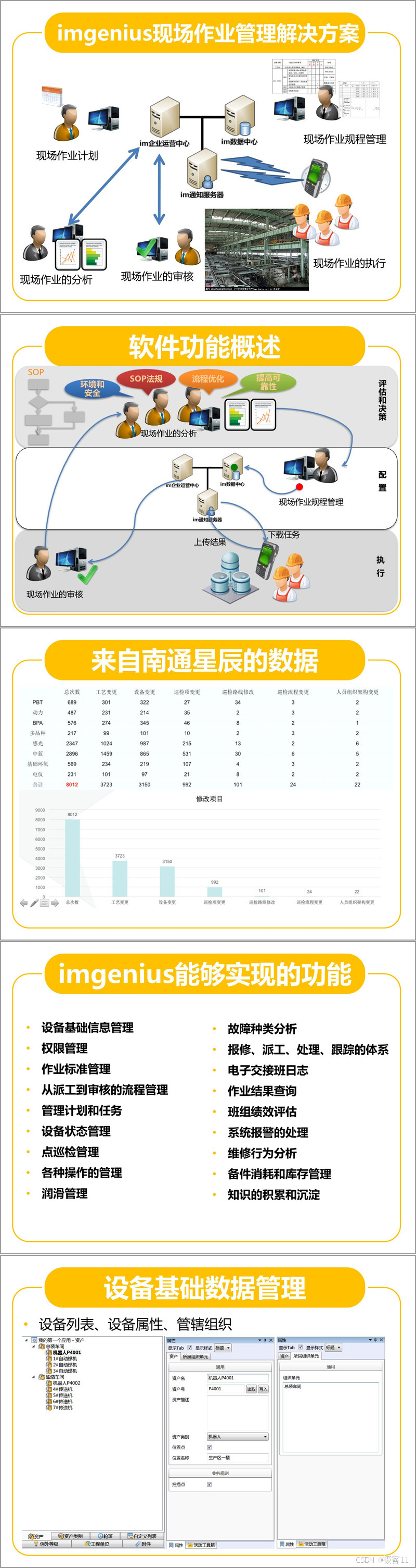 作业流程管理实现全周期管控:计划层支持按日、周、月制定巡检任务,可重复执行并关联设备与人员;执行层通过某著名企业终端实时接收任务,现场录入数据并上传图片、日志,系统自动校验数据合理性(如连续 6 次数据上升触发趋势警告);审核层通过可视化界面追溯作业详情,支持多级审批与异常标记;分析层则生成设备状态时序图、故障种类分析等报表,如南通星辰案例中,系统累计记录 8012 次变更(含工艺、设备等类型),为流程优化提供数据支撑。