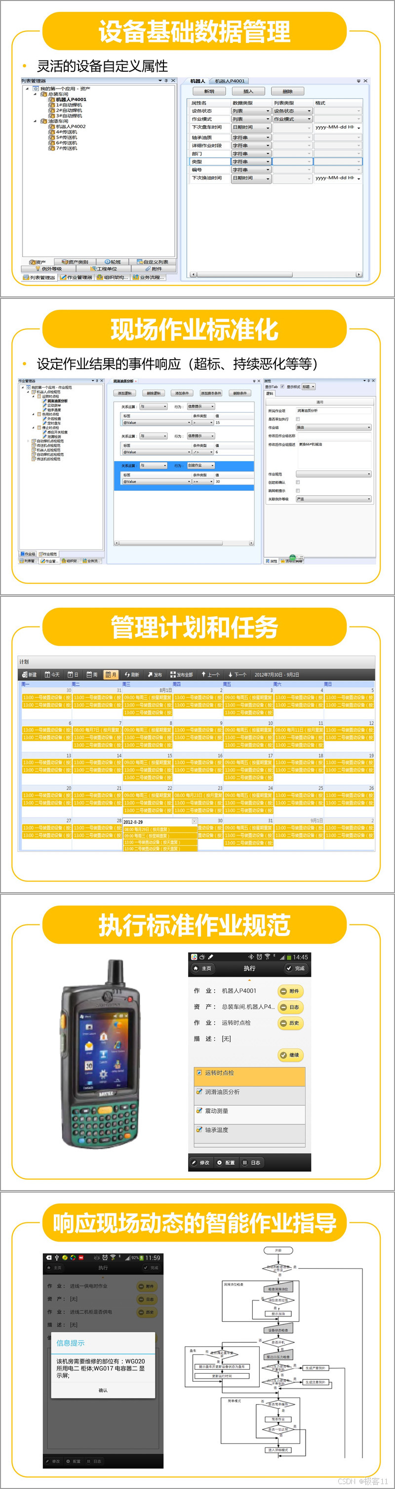 核心功能构建了 “基础数据 - 作业全流程 - 智能分析” 的闭环体系。基础数据管理模块支持设备信息的精细化维护,可自定义设备属性(如机器人的下次换油时间、轴承油质等),并通过组织架构与权限设置确保数据权责清晰。现场作业标准化是系统核心,通过作业规程管理将安全规范、设备点检标准等数字化,如设定机器人运转时点检的润滑油质、震动测量等项,并关联阈值触发机制(如油质超标自动提示加油),确保操作合规。