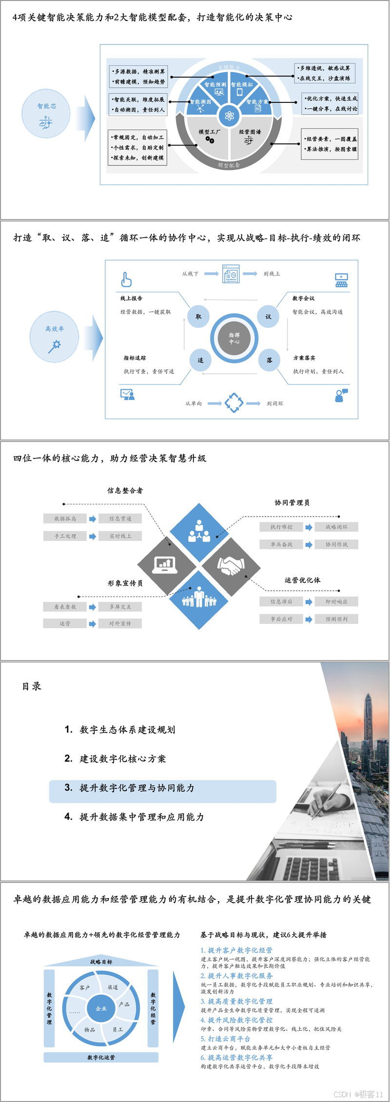提升数字化管理与协同能力需落实六大举措:建立客户统一视图实现 “数据通、渠道通、营销通、服务通”;通过数字化手段赋能人事服务;构建产品全生命周期质量管理体系,实现正向透明与逆向追溯;以 “印章 + 合同” 为抓手强化风险管控;搭建云商平台赋能自主经营;构建共享运营平台降本增效。