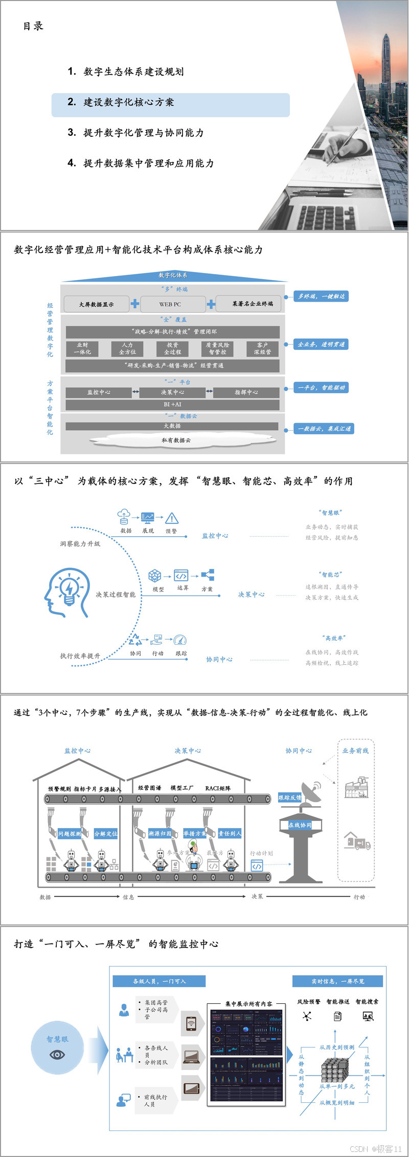 建设数字化核心方案聚焦后援集中平台,分三阶段实现作业集中共享、支持交叉销售及对外能力输出,助力业务协同与降本增效。同时打造综合大后台,通过财务、人力、风控等平台实现集中管理;建设经营分析平台,实现全域数据覆盖与透明管理。核心方案以 “三中心” 为载体,监控中心作为 “智慧眼” 实时捕获业务动态,决策中心作为 “智能芯” 支持智能决策,协同中心提升执行效率,形成从数据到行动的智能化闭环。