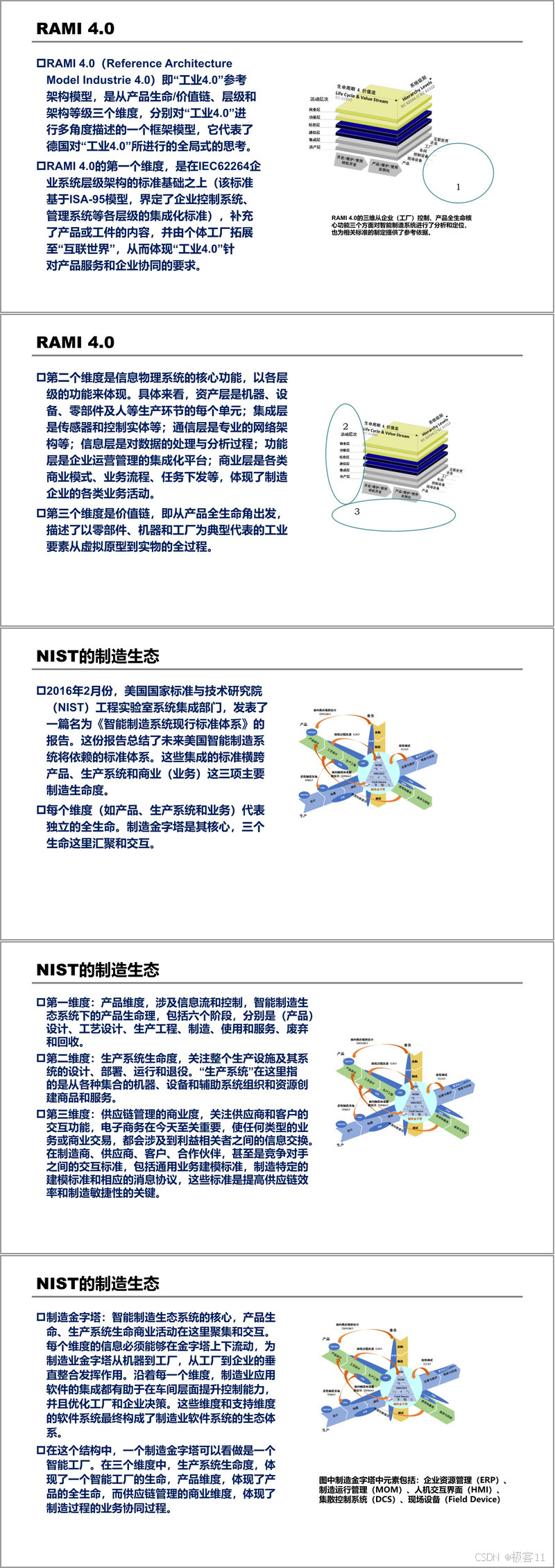 国际上,德国 “工业 4.0” 以信息物理系统(CPS)为核心,通过智能工厂、智能生产两大主题,实现横向(企业间)、纵向(企业内)、端到端(全价值链)三大集成,并依托 RAMI 4.0 参考架构模型从层级、功能、价值链三维度构建体系。美国 NIST 的制造生态则聚焦产品、生产系统、供应链管理三个维度,以制造金字塔为核心实现信息交互。我国《国家智能制造标准体系建设指南》从生命周期、系统层级、智能特征三个维度构建架构,明确智能工厂作为智能制造的载体,需遵循设计、交付、生产、管理等系列标准。