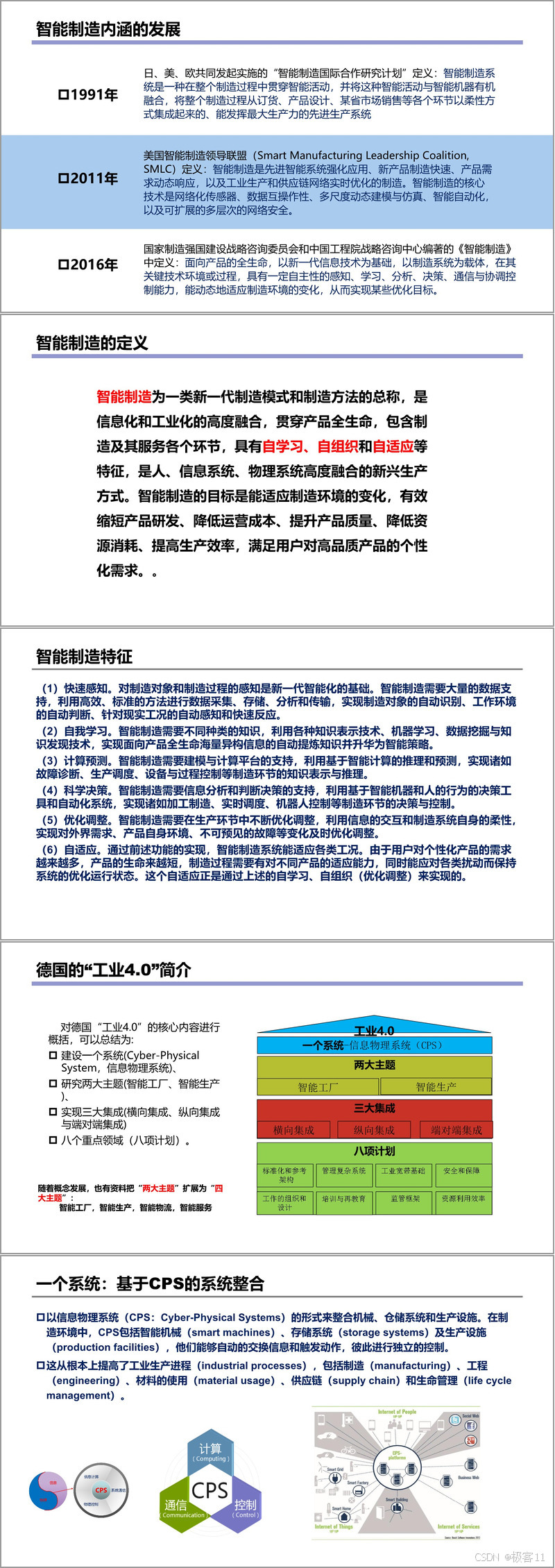 在智能制造与智能工厂部分,传统制造模式面临产品生命周期缩短、产业复杂度提升、定制化需求增长等挑战,推动制造业向 “数字化、网络化、智能化” 转型。智能制造作为新一代制造模式,是信息化与工业化的高度融合,贯穿产品全生命周期,具备快速感知、自我学习、计算预测、科学决策、优化调整、自适应等特征,旨在缩短研发周期、降低成本、提升质量与效率。