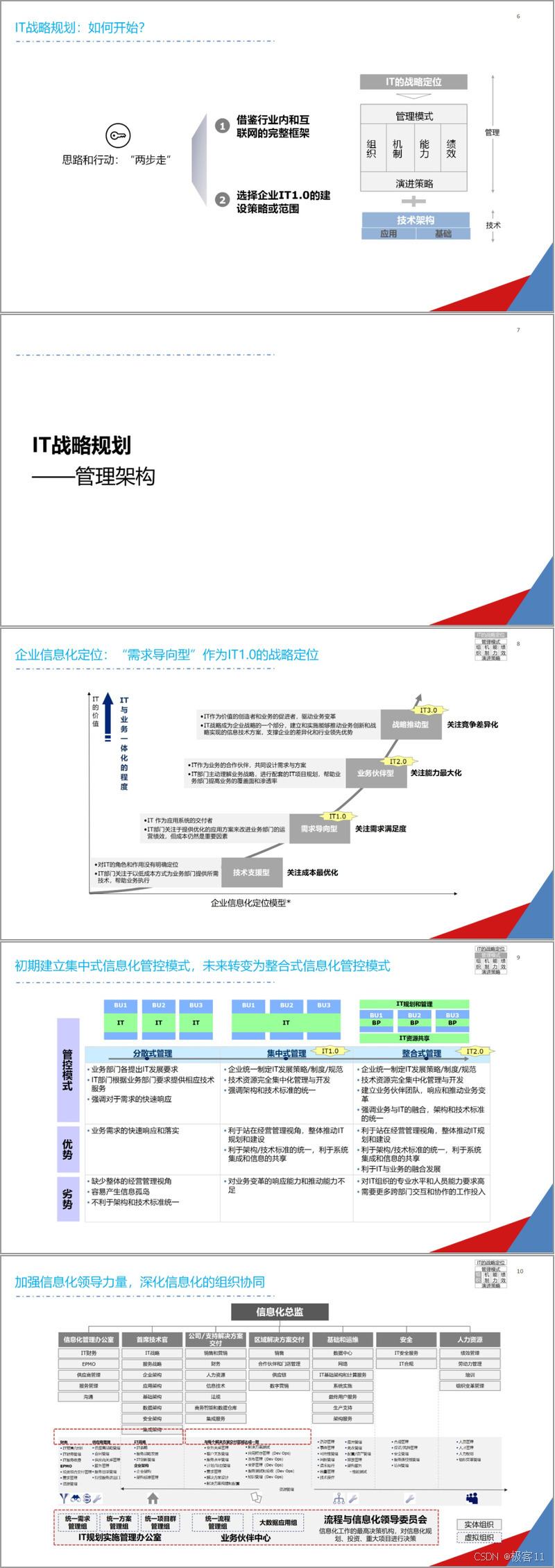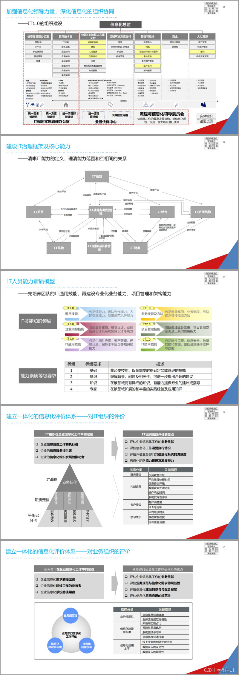 管理架构上,企业信息化定位逐步演进。IT 1.0 为 “需求导向型”,聚焦需求满足与成本控制;IT 2.0 为 “业务伙伴型”,主动规划 IT 项目以提升业务覆盖面;IT 3.0 为 “战略推动型”,驱动业务变革与创新。管控模式从分散式到集中式,最终走向整合式,强调资源共享与业务融合。同时,需加强信息化领导,建立完善组织架构,明确各部门职责,成立最高决策机构。此外,要建设 IT 治理框架,定义人员能力素质模型,建立一体化评价体系,涵盖财务、运营等多维度指标。