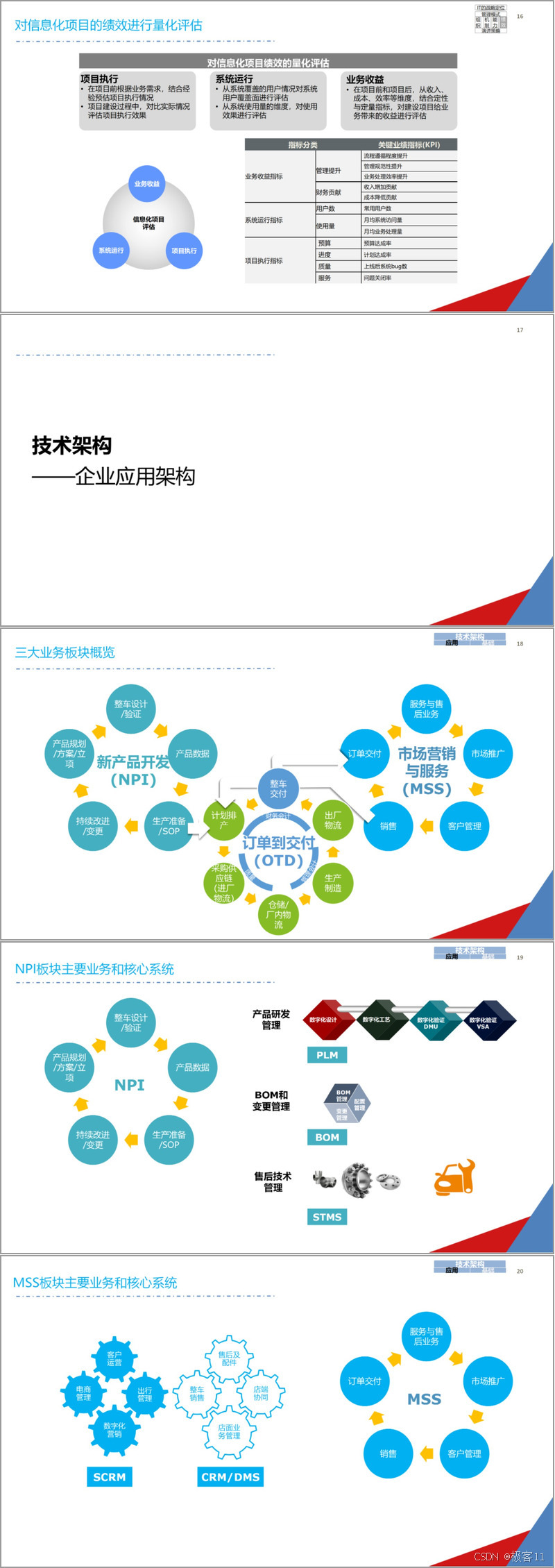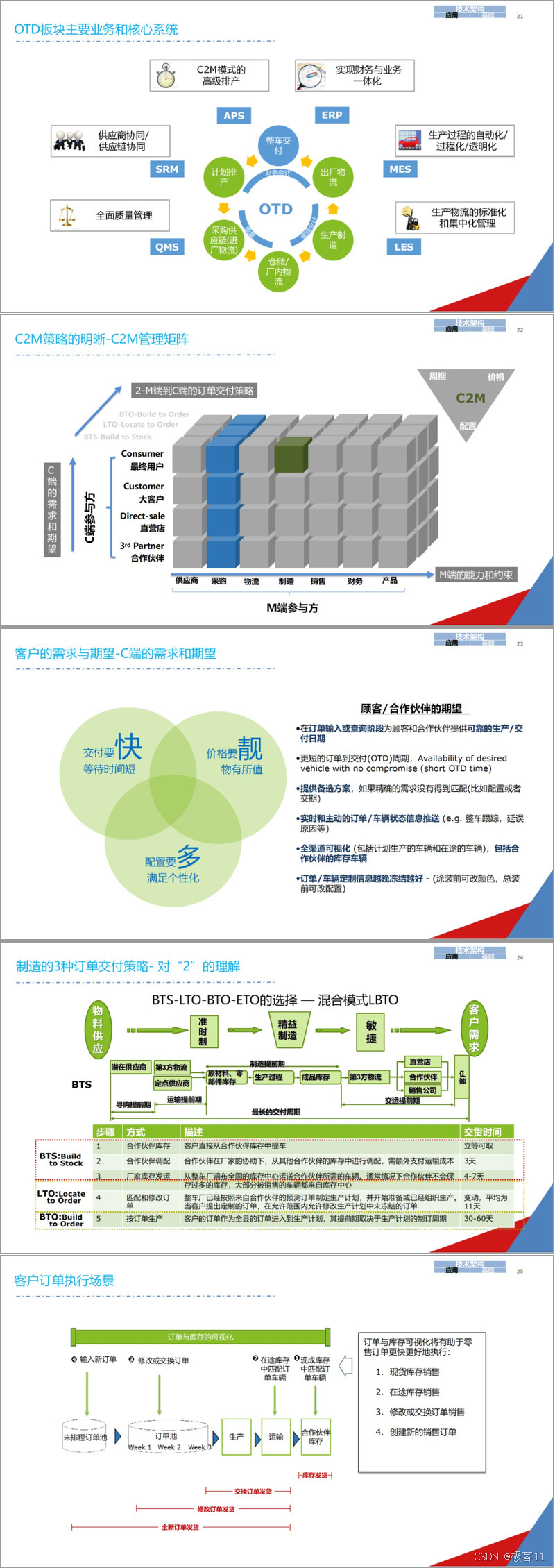 应用架构涉及多个业务板块。NPI 板块围绕产品研发,涵盖设计、验证、数据管理等系统;MSS 板块聚焦服务与售后,包含客户管理、销售等系统;OTD 板块则涉及生产、供应链等系统,以实现 C2M 模式等。C2M 模式落地需从产品结构、营销模式、客户体验和产销衔接四方面着手,满足客户个性化需求,保障订单及时响应与执行。营销系统需遵循六大原则,实现全渠道管理与客户全生命周期服务,构建出行服务生态。PLM、BOM、MES、物流、供应商管理、QMS 等系统各有其功能与业务流程,共同支撑企业运营。