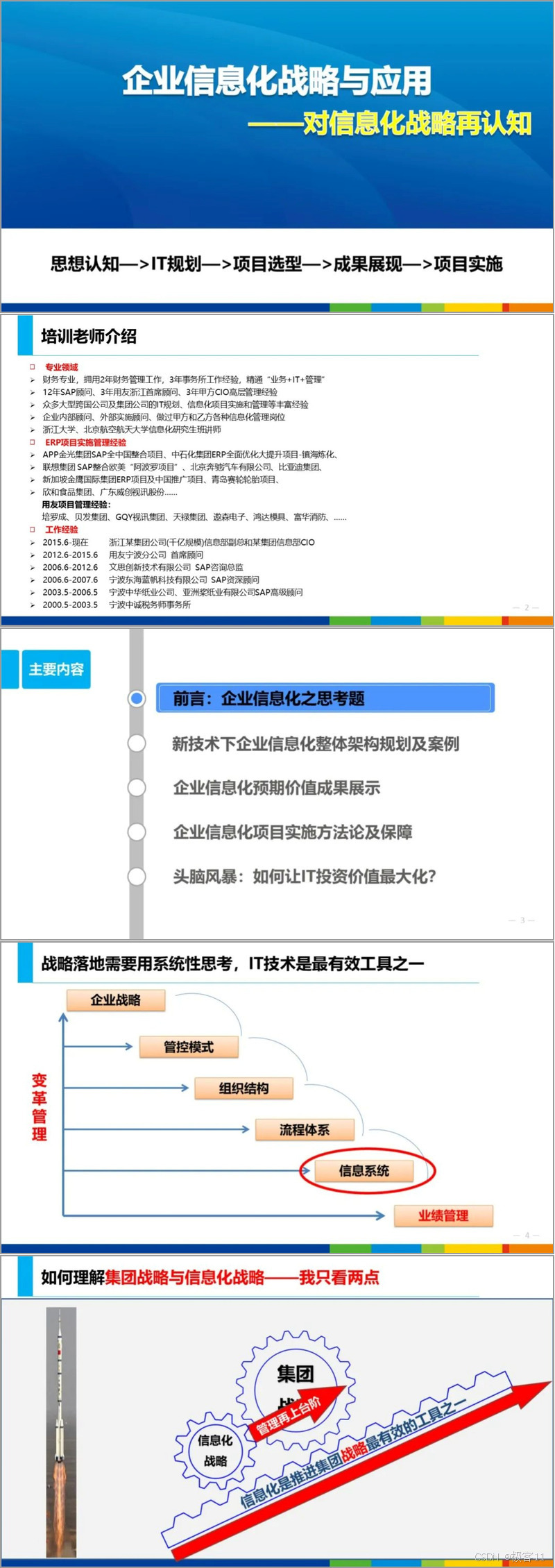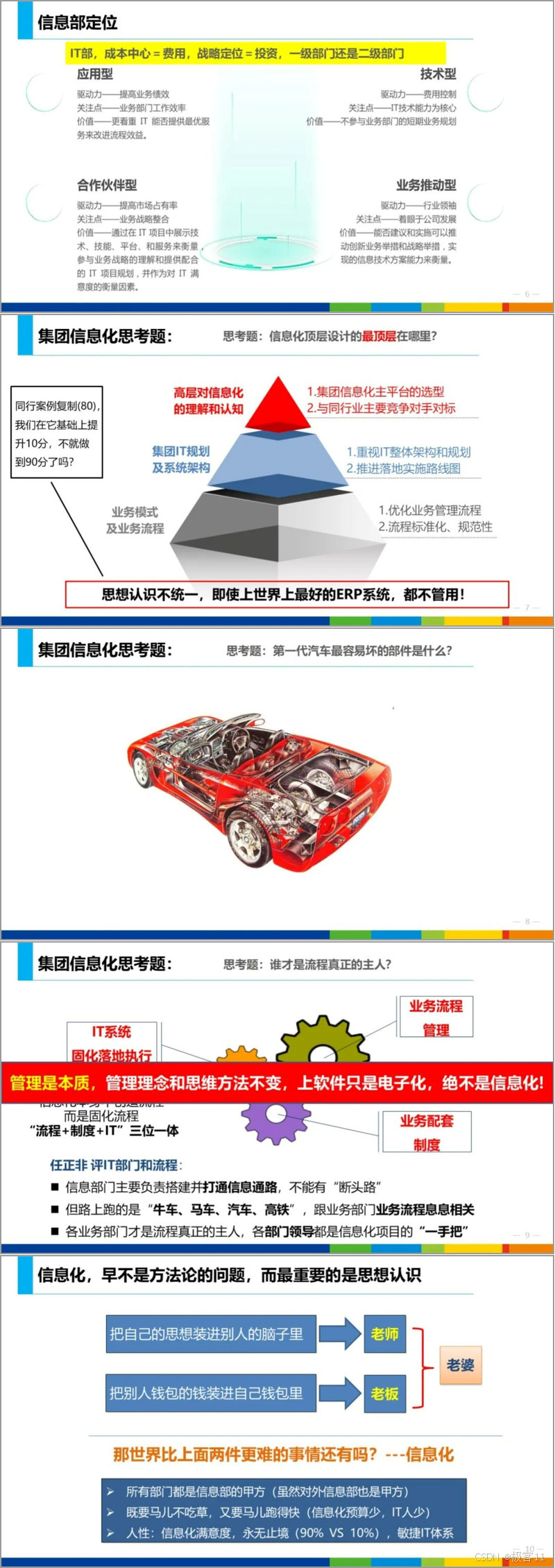 战略落地需系统性思考,IT 技术是有效工具之一,涉及企业战略、管控模式等多方面。集团战略与信息化战略的关系中,信息化是推进集团战略的有效工具。集团信息化存在诸多思考题,如信息化顶层设计的最顶层、第一代汽车最易坏部件、谁是流程真正主人等,强调思想认识统一的重要性,业务部门才是流程真正的主人,管理是本质。