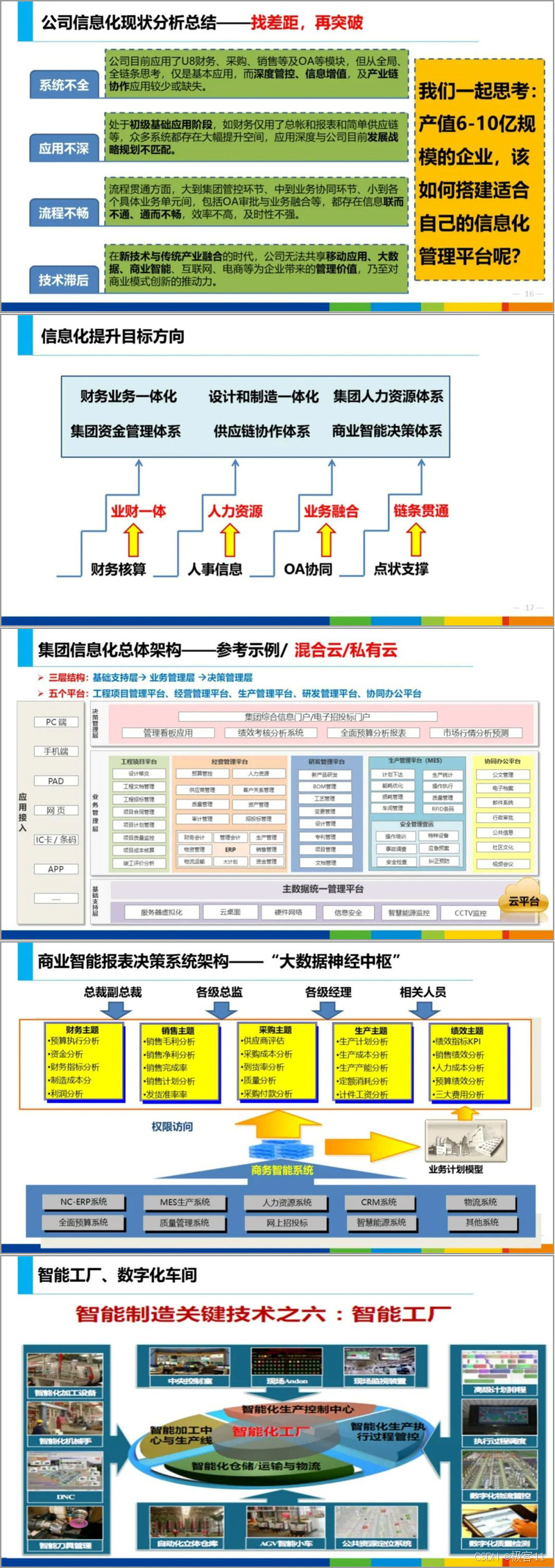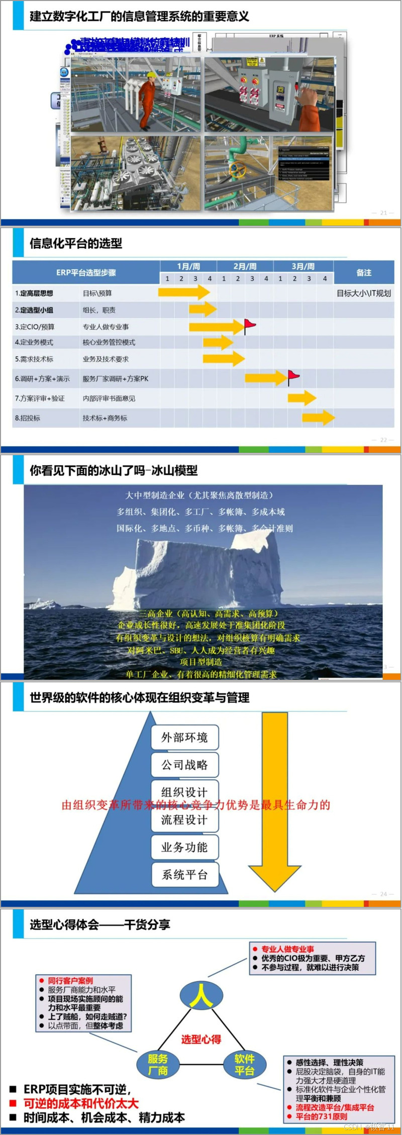 信息化平台选型有明确步骤,冰山模型揭示了不同企业特点。世界级软件核心体现在组织变革与管理,选型有诸多心得体会。财务、采购、销售等领域的信息化应用有显著效果,多维度智能报表分析助力管理。集团人力资源系统规划全面,涵盖多个方面,全自动考勤管理报表数据详细。数字化看板在生产、销售等环节发挥重要作用,智能制造有成果案例展示,预警信息综合看板和神经中枢应用示例助力管理,移动应用方便信息通知。