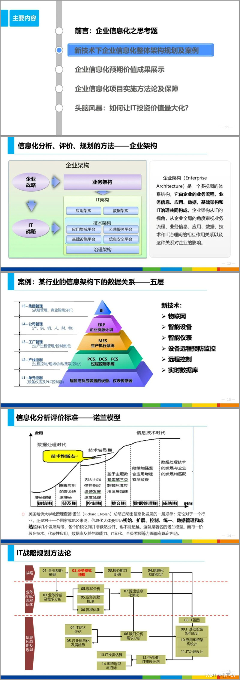 内容主要包括前言的企业信息化思考题、新技术下企业信息化整体架构规划及案例、预期价值成果展示、项目实施方法论及保障,以及关于如何让 IT 投资价值最大化的头脑风暴。