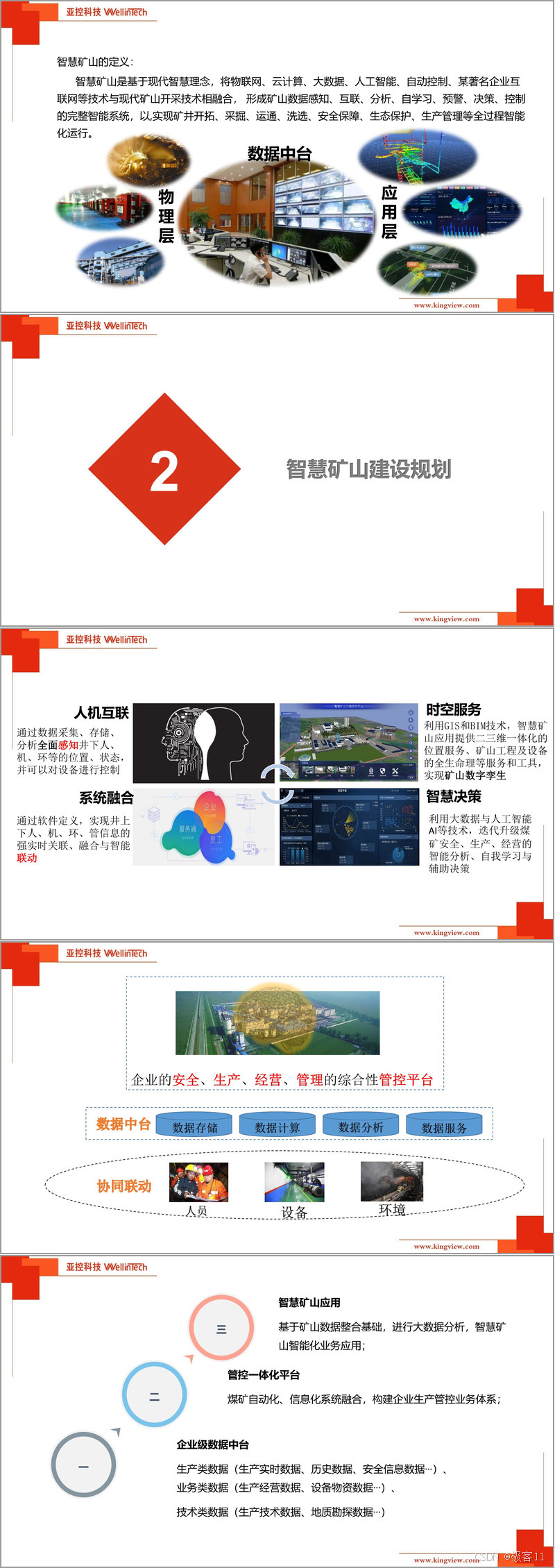 智慧矿山建设规划包括时空服务、人机互联、智慧决策和系统融合。借助 GIS 和 BIM 技术实现数字孪生,通过数据采集感知井下状况并控制设备,利用大数据与 AI 技术辅助决策,通过软件定义实现信息关联融合。其核心是企业级数据中台、管控一体化平台及智慧矿山应用,数据中台负责数据存储、计算等,管控一体化平台融合现有系统,智慧矿山应用实现信息闭环。