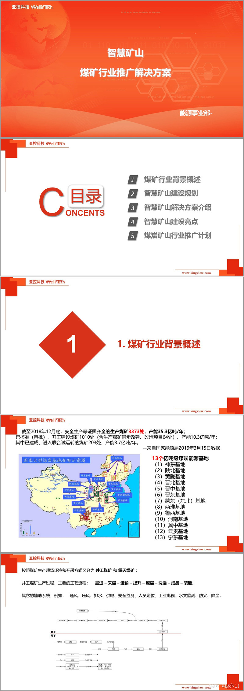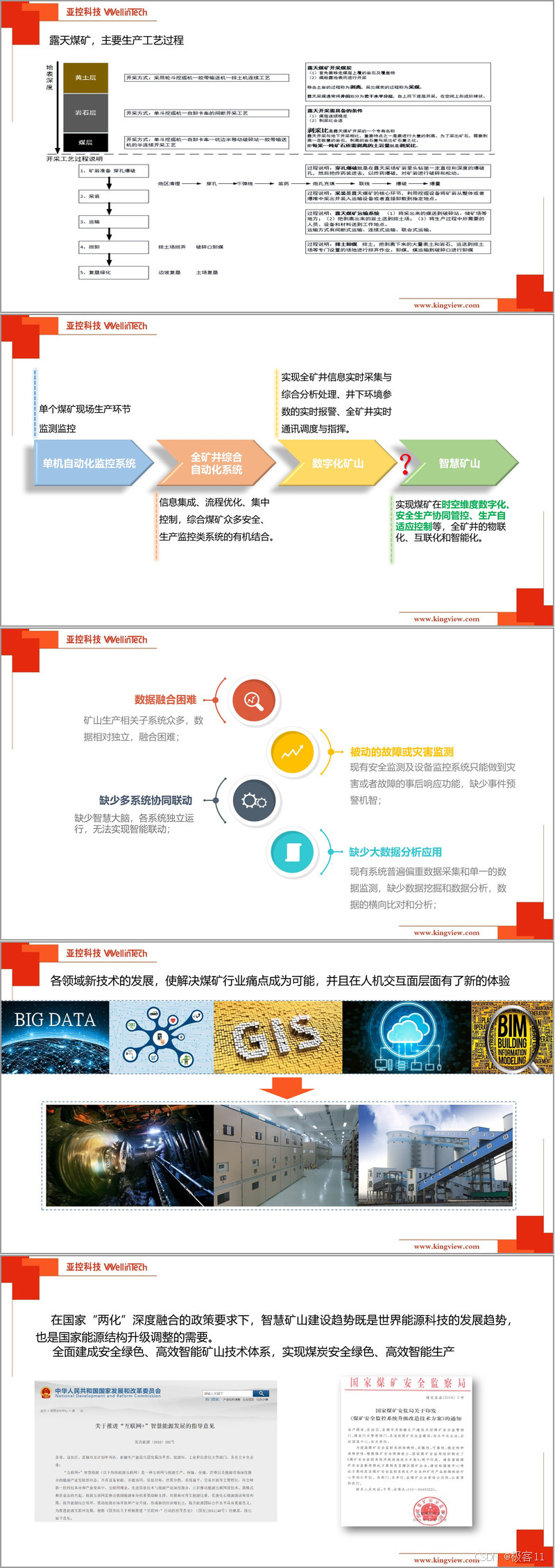 从行业背景来看,截至 2018 年底,我国安全生产等证照齐全的生产煤矿有 3373 处,产能达 35.3 亿吨 / 年,还有众多在建煤矿。全国分布着 13 个亿吨级煤炭能源基地,煤矿分为井工煤矿和露天煤矿,二者生产工艺流程及辅助系统各有不同。当前煤矿行业存在数据融合困难、被动监测、系统缺乏协同联动、大数据分析应用不足等痛点,而新技术发展和国家政策推动为智慧矿山建设提供了可能。